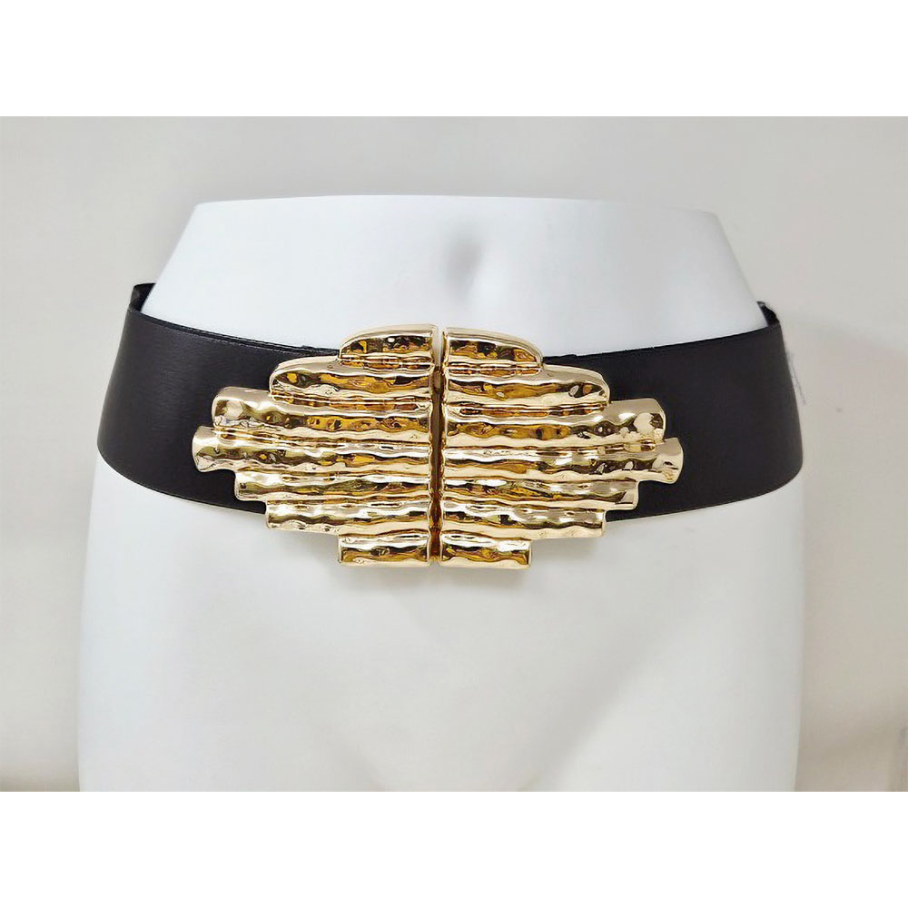 Details • Size : 3.75" H, 30" L • Stretchable • Define your silhouette with this textured statement buckle waist belt, crafted with a bold design that blends elegance and edge. Its wide strap and eye-catching buckle make it a standout accessory, perfect for elevating casual looks or enhancing evening outfits. • Lead and Nickel Compliant