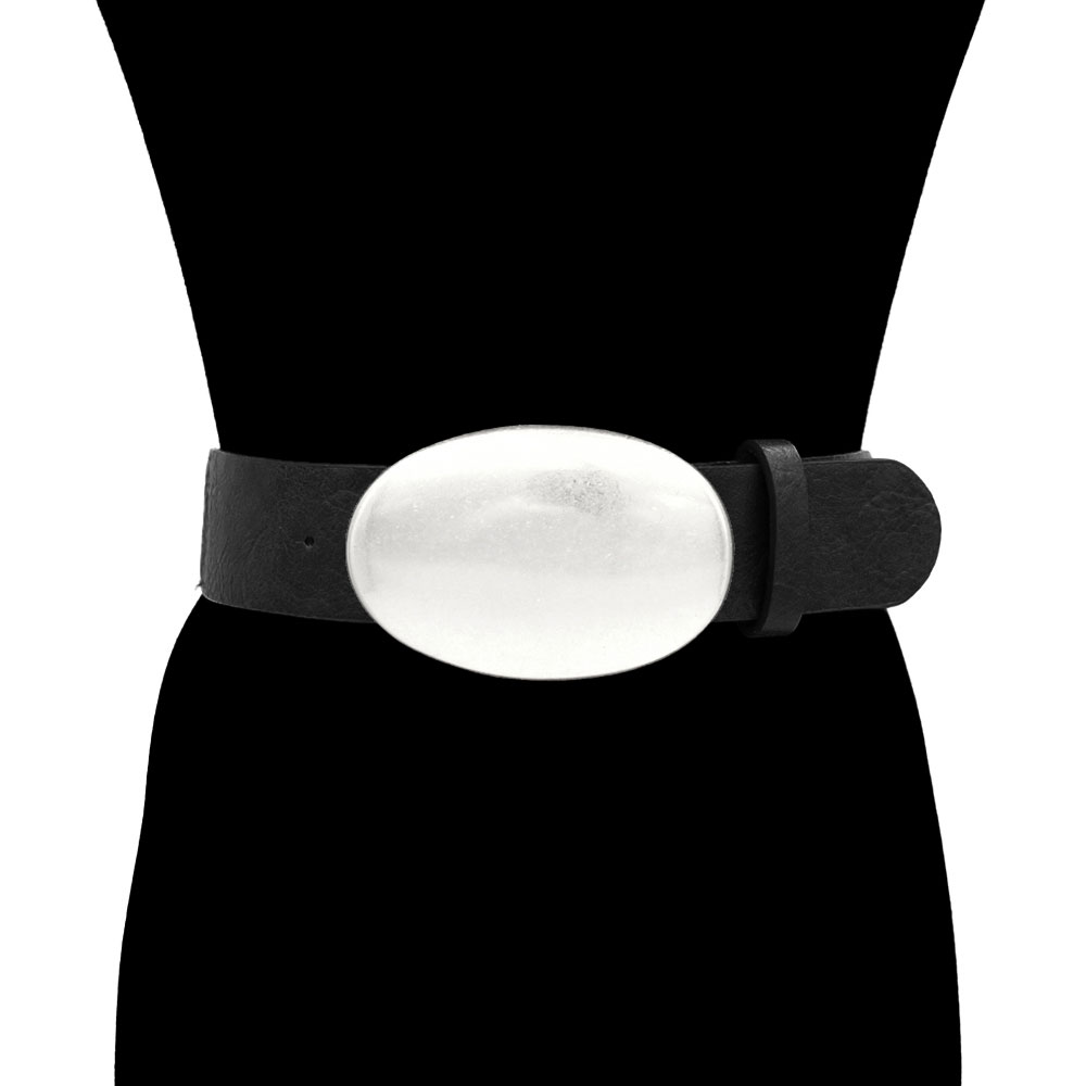 • This oval buckle statement belt combines bold design with refined elegance. Featuring a sleek wide band and a smooth, polished buckle, it adds a sophisticated accent to any outfit. Perfect for cinching the waist or enhancing casual and dressy looks with timeless appeal.