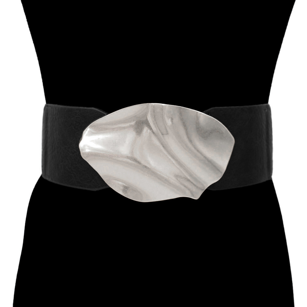 Bold Textured Metal Abstract Oval Buckle Accent Elastic Waist Belt