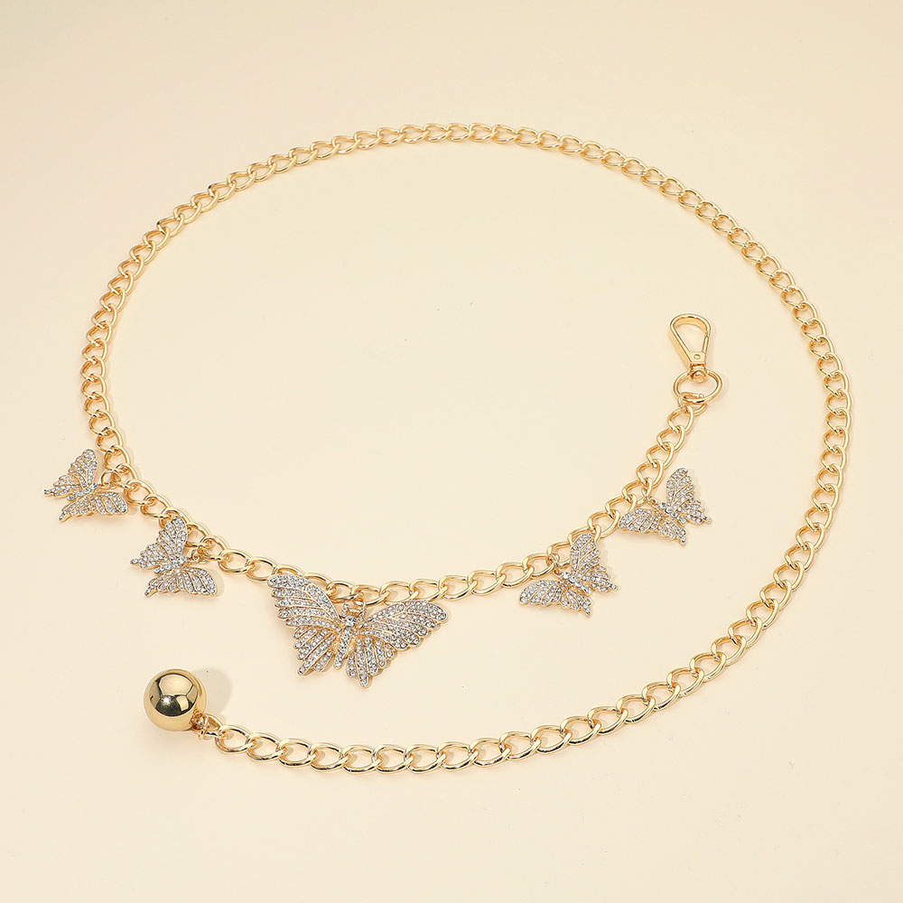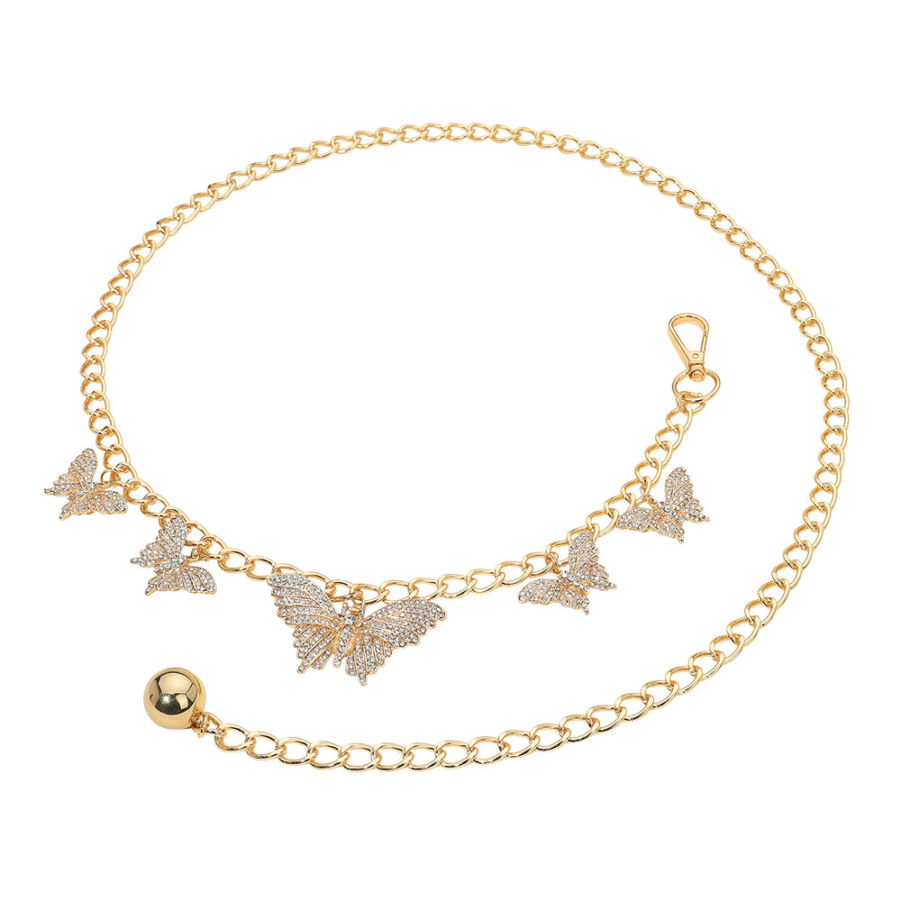 Details • Size : 1.75" H, 45" L • Embrace elegance with this butterfly charm rhinestone chain waist belt, designed to shimmer with every movement. Perfect for enhancing dresses or evening outfits, its delicate butterfly details add a touch of femininity and glamour to your sophisticated style. • Lead and Nickel Compliant