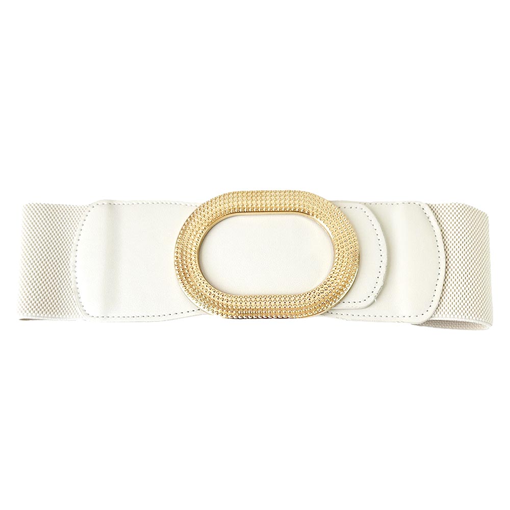 Textured Metal Oval Buckle Accent Wide Elastic Waist Belt