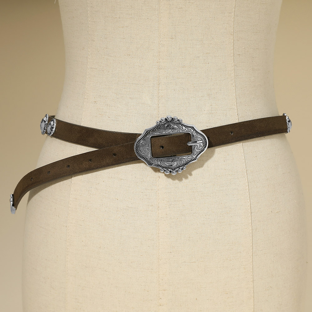 • Elevate your outfit with this western style belt featuring an engraved vintage buckle and adjustable fit. Perfect for adding a bold touch to dresses, jeans, or casual looks, this statement accessory blends classic western charm with versatile everyday style.
