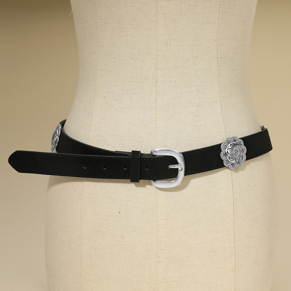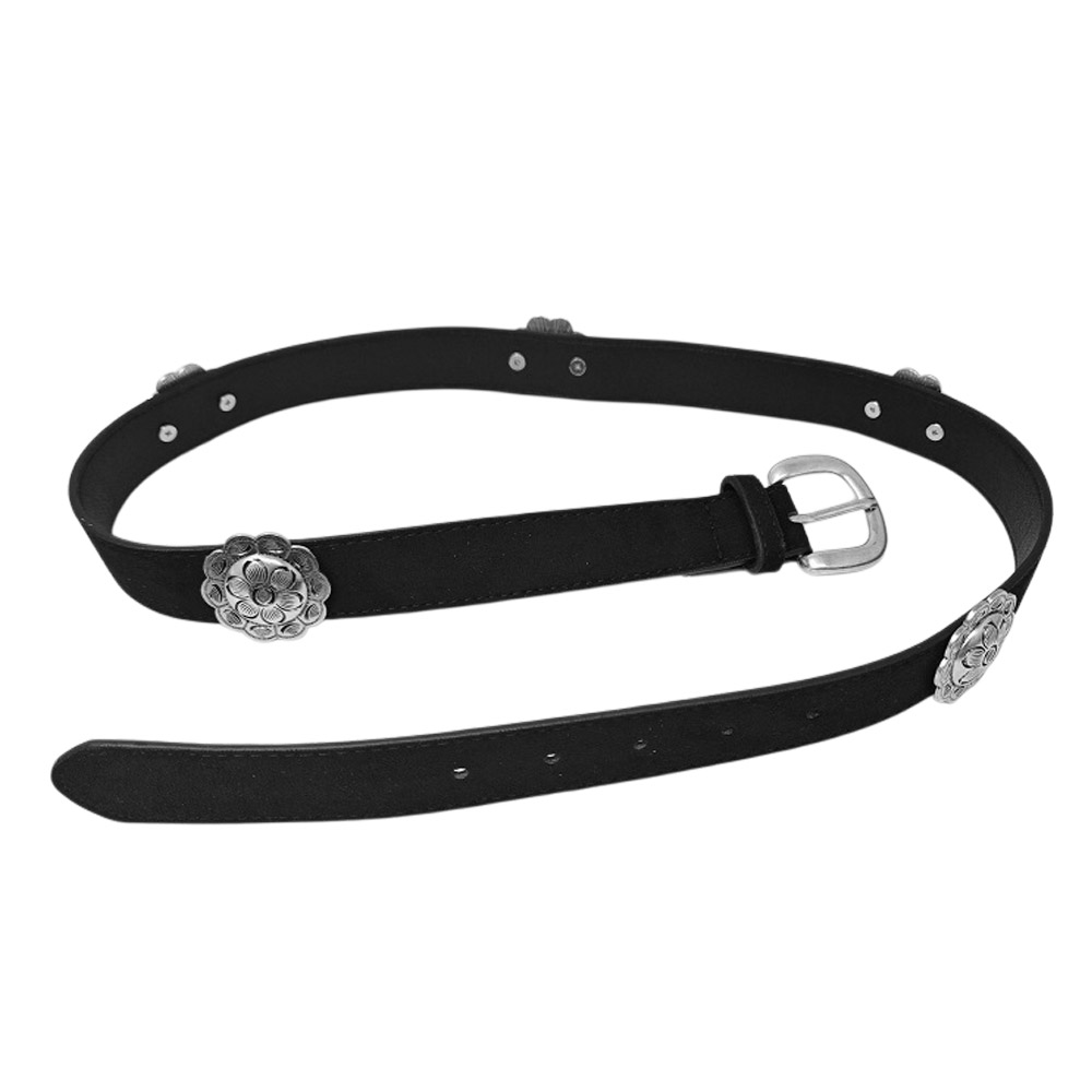 Details • Adjustable 35" - 39" L • Approximately 2" H X 42" L • Add a western-inspired touch to your outfit with this concho belt featuring engraved silver accents and a classic buckle. Designed for versatile styling, it pairs effortlessly with jeans, skirts, or dresses, making it a standout accessory for casual or chic looks. • Lead and Nickel Compliant