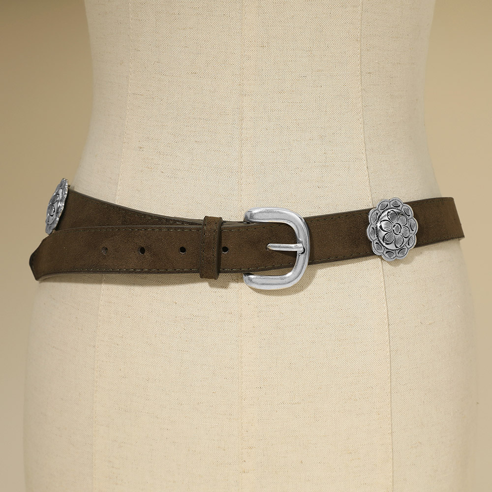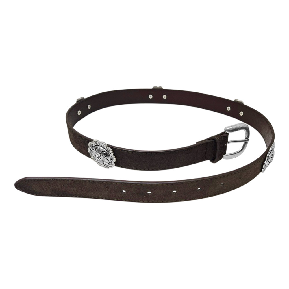 Details • Adjustable 35" - 39" L • Approximately 2" H X 42" L • Add a western-inspired touch to your outfit with this concho belt featuring engraved silver accents and a classic buckle. Designed for versatile styling, it pairs effortlessly with jeans, skirts, or dresses, making it a standout accessory for casual or chic looks. • Lead and Nickel Compliant