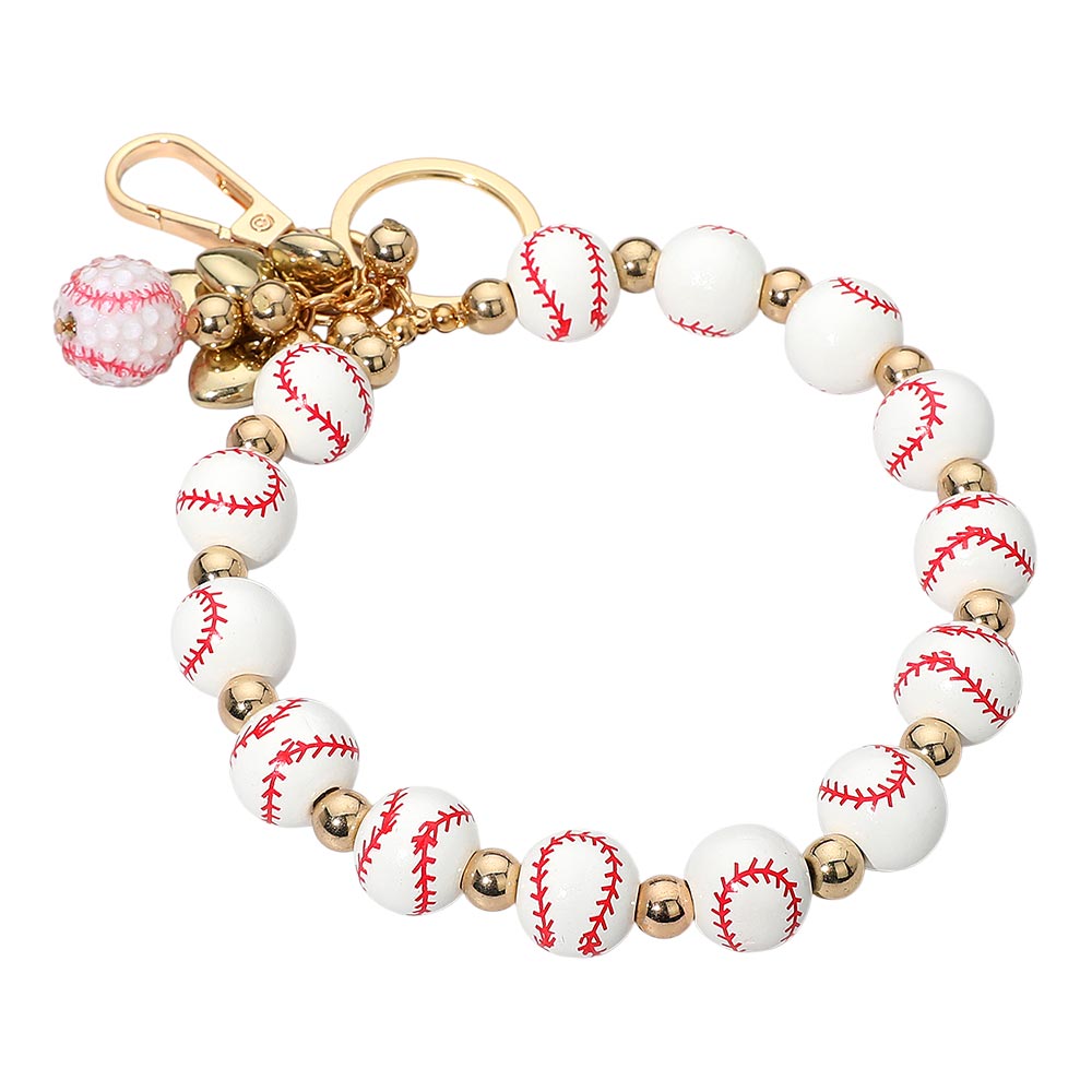 Details • Size : 4" D, 8" L • Sporty keychain bracelet featuring baseball beads and metallic accents with a stylish clasp and charm detail. Perfect for soccer fans or active lifestyles, this playful accessory adds a fun touch to keys, handbags, or gameday outfits. • Lead and Nickel Compliant