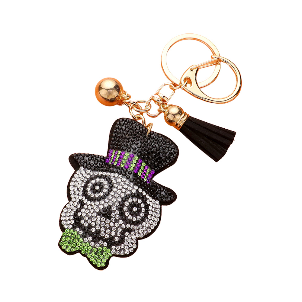 Details • Size : 2.25" X 2.7", 6" L • Add spooky style to your accessories with this sparkling skull keychain featuring a playful top hat and bow tie. Perfect for Halloween, parties, or as a unique gift, this charm brings festive flair and a touch of fun to bags, keys, or backpacks. • Lead and Nickel Compliant