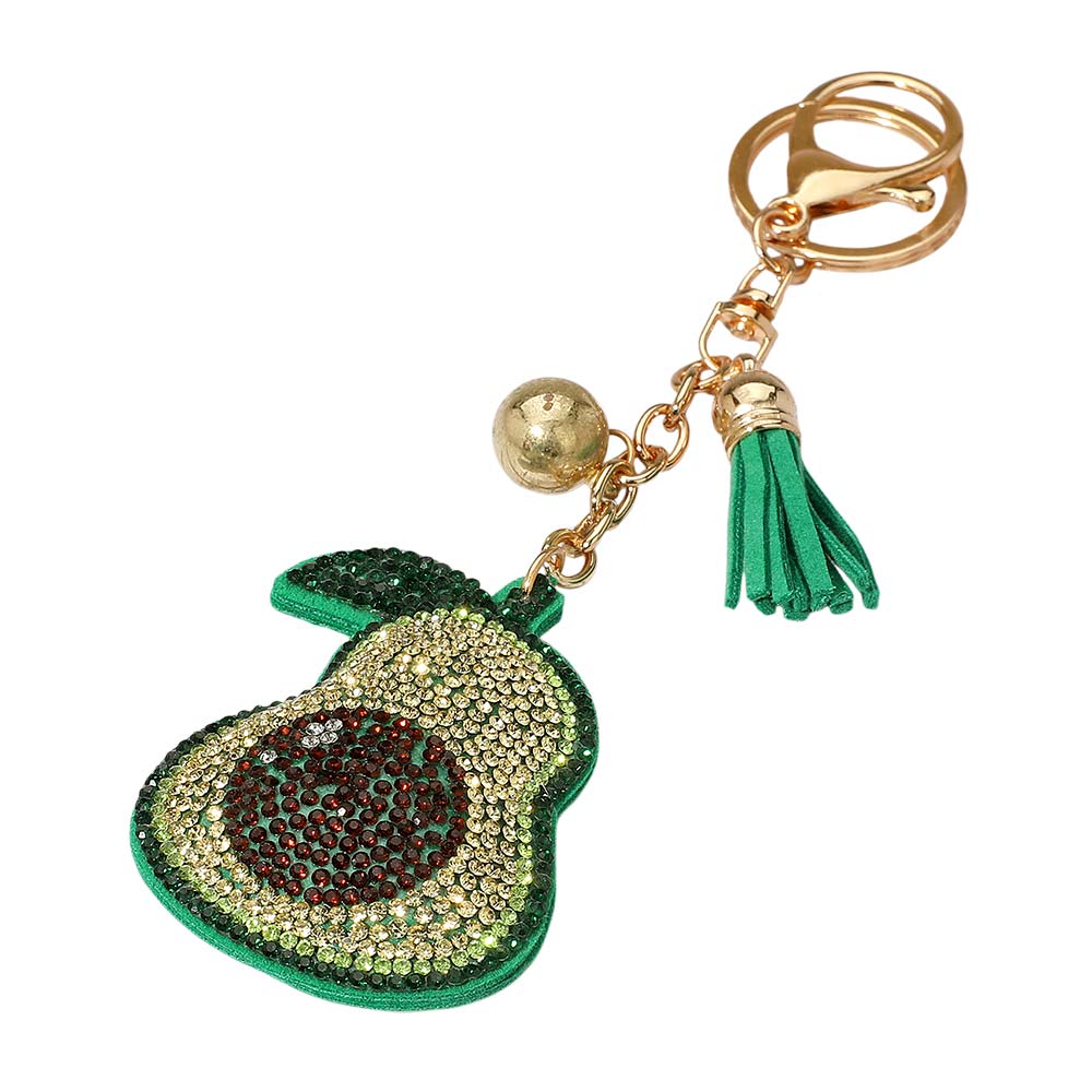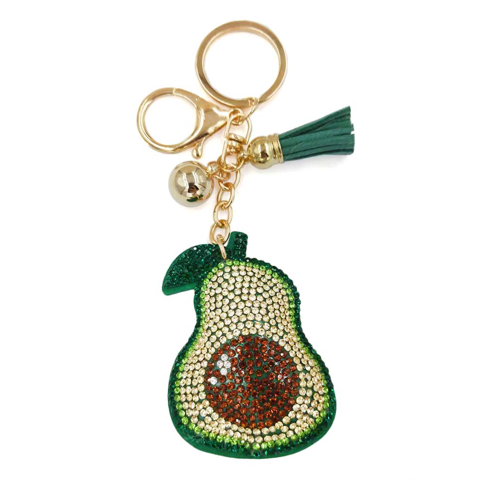 Details • Size : 6.5" L / 2" X 2.75" • Add a fun twist to your accessories with this sparkling avocado keychain, adorned with shimmering crystals, a playful tassel, and a metallic clasp. Perfect for keys, purses, or backpacks, this trendy charm offers a unique and eye-catching accent while keeping your essentials stylishly secure. • Lead and Nickel Compliant