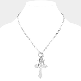 CZ Stone Paved Cross Accent Two Tone Braided Cuff Bracelet