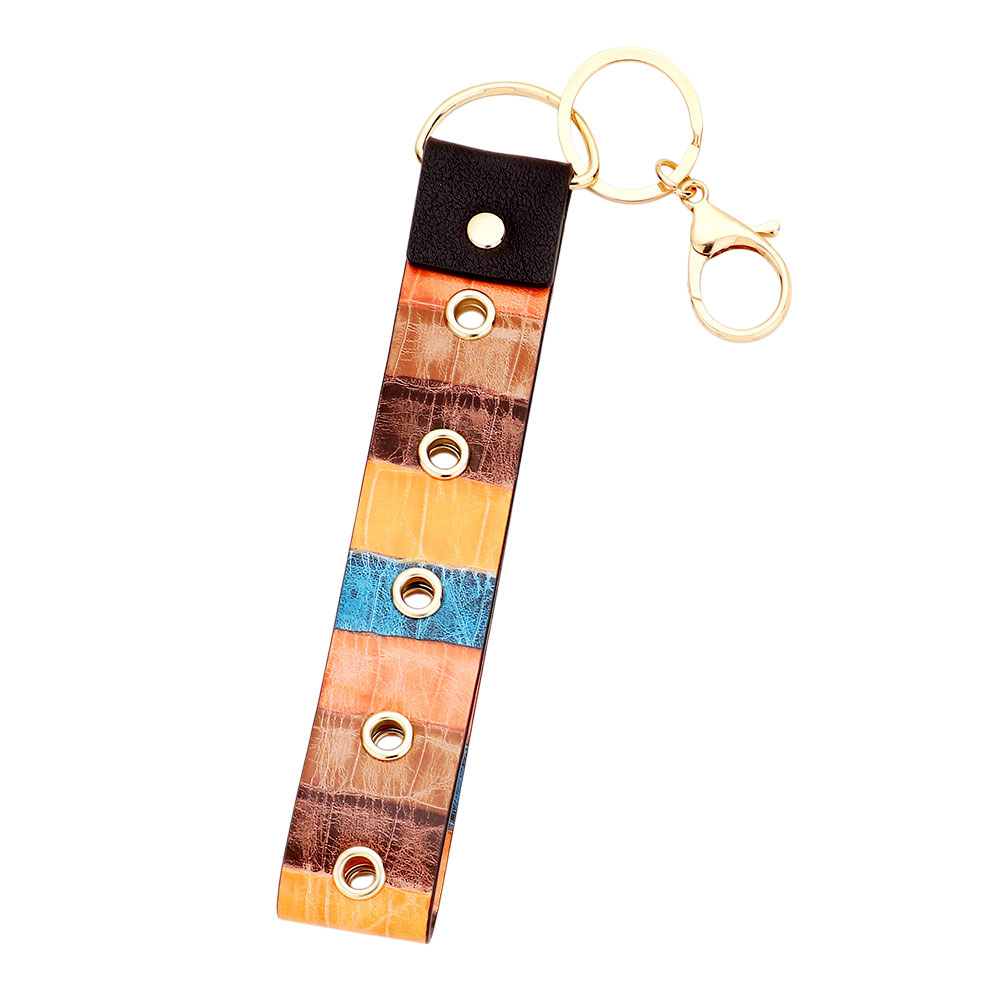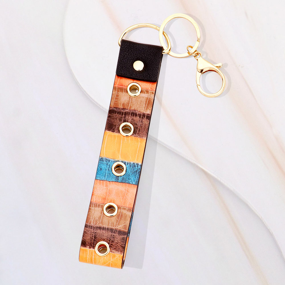 Details • Size : 1.2" X 6.25", 9.5" L • Brighten your everyday essentials with this multicolor striped leather keychain featuring bold tones, gold grommet accents, and a secure keyring with clasp. Stylish and practical, it keeps keys organized while adding a trendy touch, making it a perfect gift or personal accessory. • Lead and Nickel Compliant