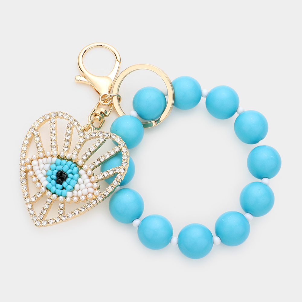 Evil Eye Centered Heart Beaded Stretch Keychain / Bracelet