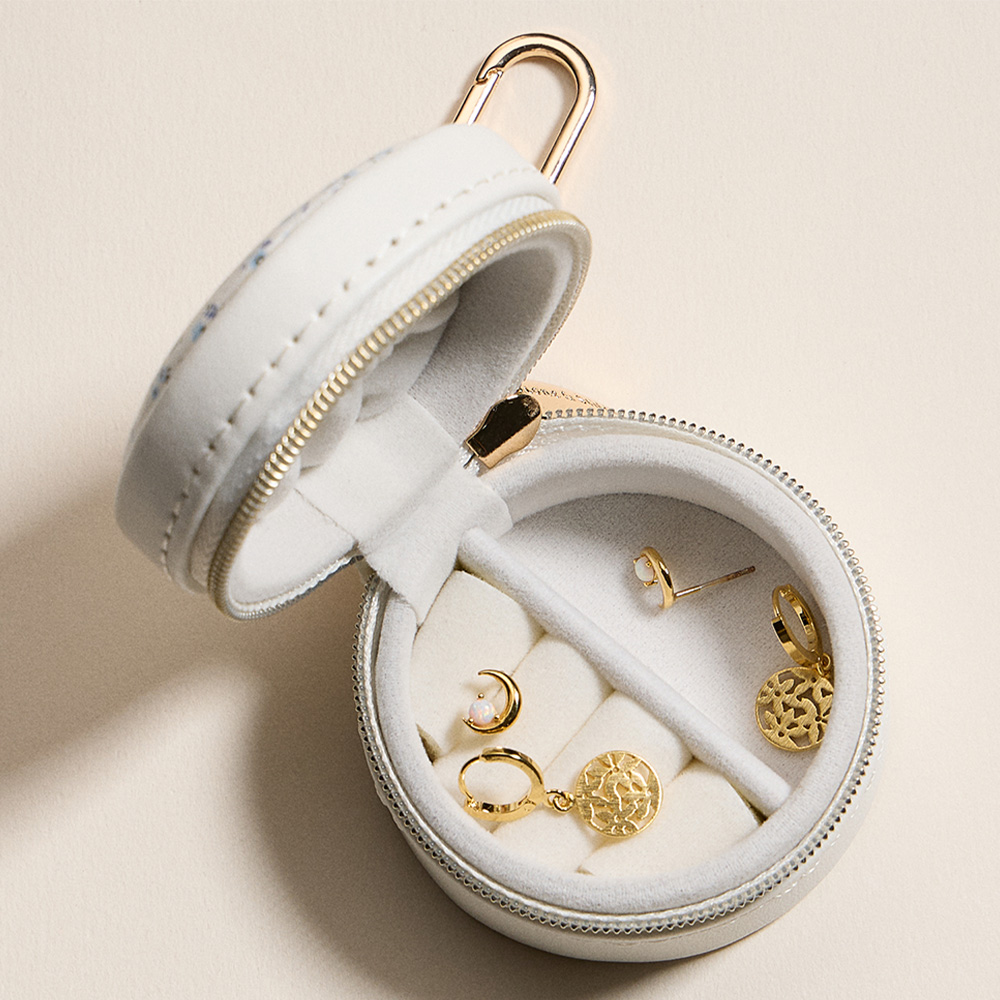 • Keep your jewelry secure with this travel storage case featuring a zipper closure and keychain clip. Its compact design offers dedicated slots for rings, earrings, and necklaces, making it an ideal organizer for travel or daily use.
