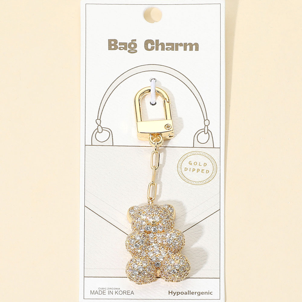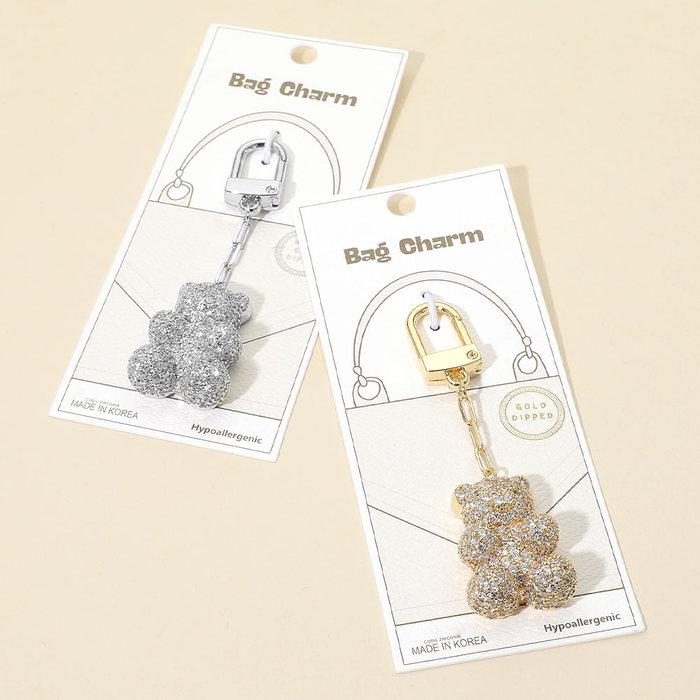 Details • Size : 3.5" L, 1" X 1.6" • Elevate your accessories with this adorable teddy bear bag charm adorned with shimmering cubic zirconia. Perfect for handbags or backpacks, it combines playful style with sparkling elegance. • CZ Cubic Zirconia • Gold Dipped • Hypoallergenic • Lead and Nickel Compliant • Made In Korea