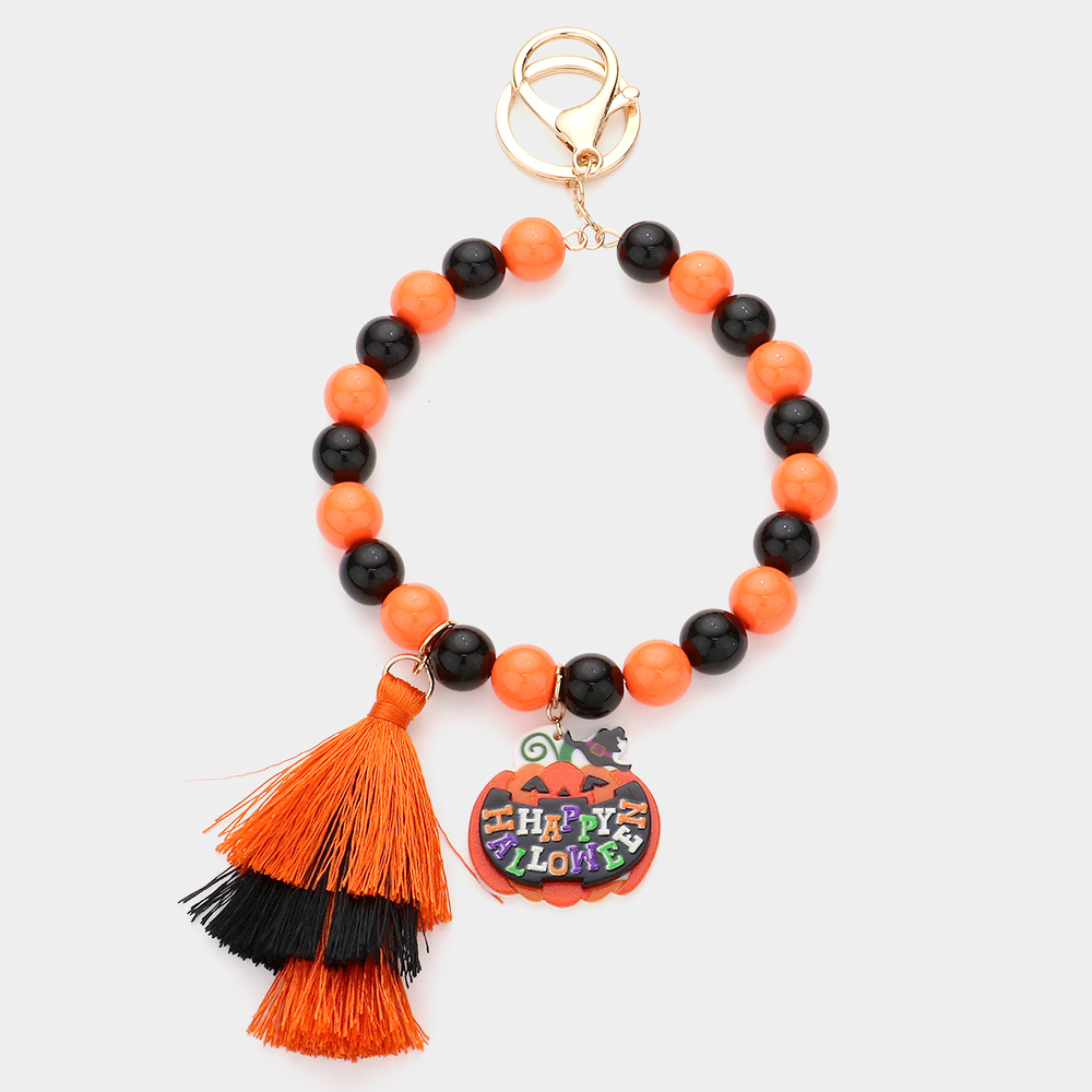 Happy Halloween Message Pumpkin Tassel Charm Beaded Keychain / Bracelet