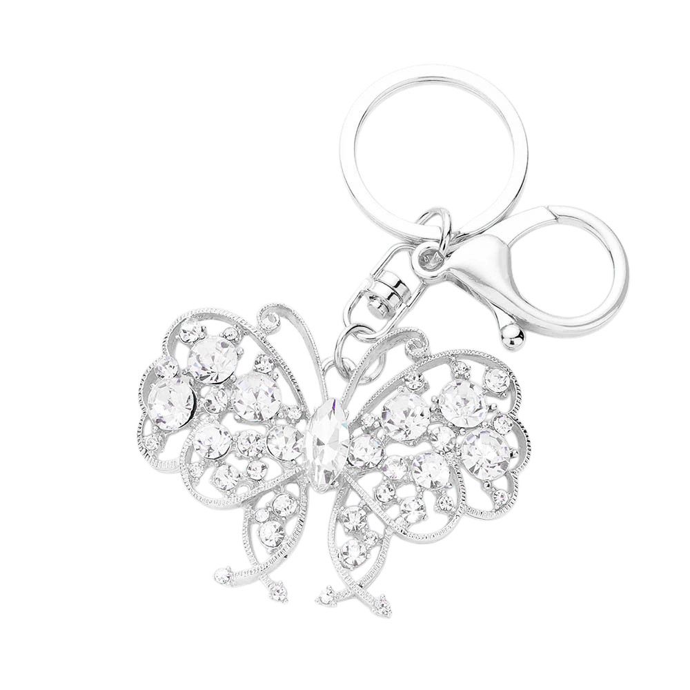 Details • Size : 2.4" x 2", 4" L • Add elegance to your accessories with this butterfly keychain featuring sparkling crystal accents. Perfect as a stylish bag charm or key holder, it makes a thoughtful gift or personal treat. Lightweight and eye-catching, this butterfly keychain enhances everyday essentials with charm and shine. • Lead and Nickel Compliant
