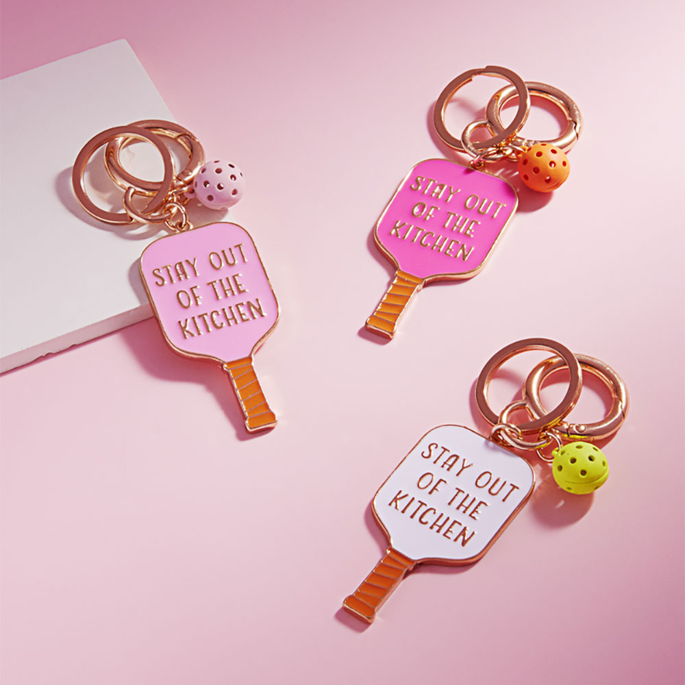 Details • Size : 3.75" L, 1.2" X 2.3" • Pickleball-themed keychain featuring a paddle charm engraved with "Stay Out of the Kitchen" and a matching mini ball. A playful and stylish accessory for fans of the game—perfect for bags, keys, or gifting. • Lead and Nickel Compliant