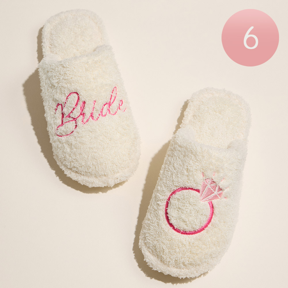 • Celebrate the bride-to-be with these cozy fuzzy slippers featuring “Bride” embroidery and a ring motif. Ideal for wedding prep, bridal showers, or lounging in style, they offer comfort with a fun and festive flair. A perfect gift for any bride’s special moments.