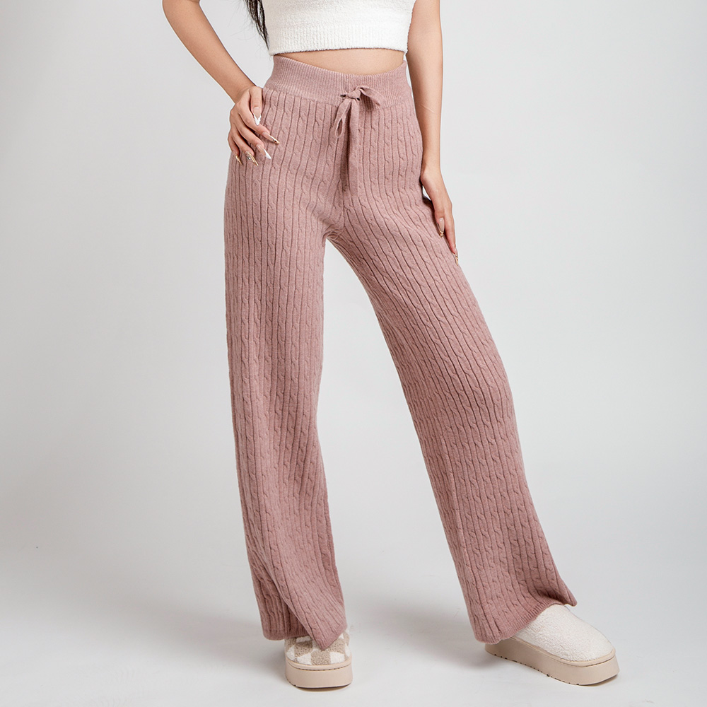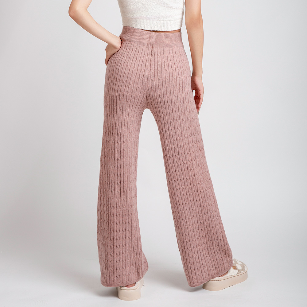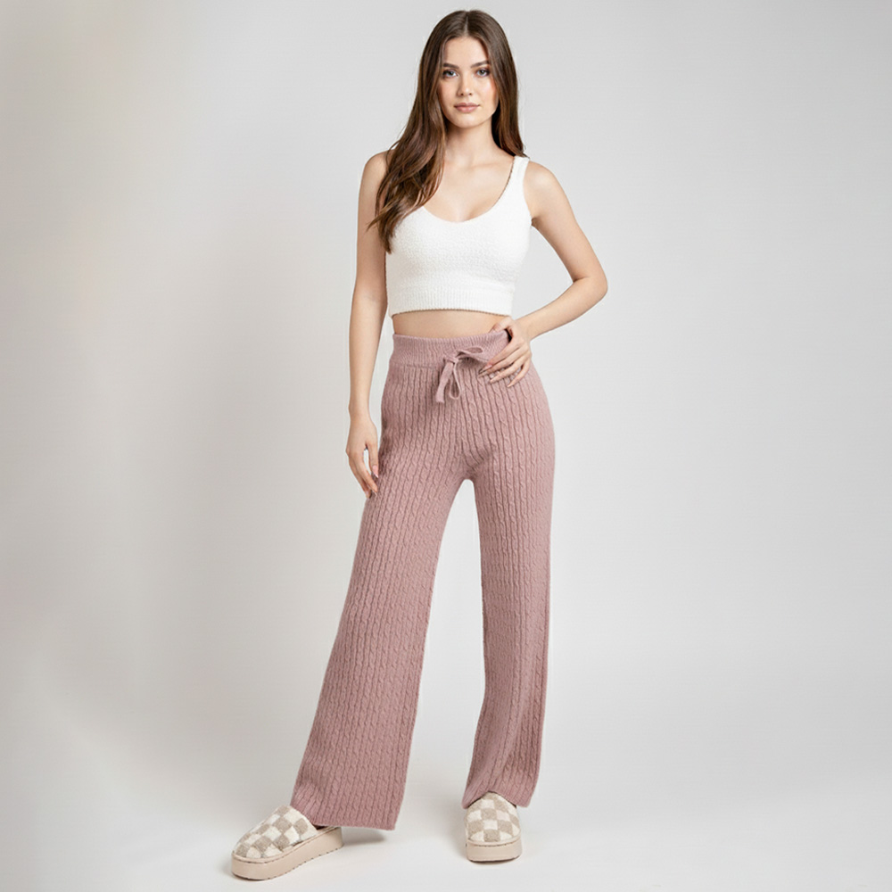 Details • Size : One Size • Material : 65% Polyester, 35% Acrylic • Features : Adjustable drawstring and elastic waistband • Care : Machine wash on the cole and gentle cycle, do not bleach, lay flat to dry or tumble dry on low, iron or steam on low, do not dry clean • Cozy cable knit lounge pants designed with a relaxed wide-leg silhouette and adjustable drawstring waist for a custom fit. Crafted for ultimate comfort, these soft knit pants are perfect for casual days, lounging at home, travel, or effortless everyday style. Pair them with sweaters, crop tops, or loungewear sets for a chic and cozy look you'll love to wear all season long.