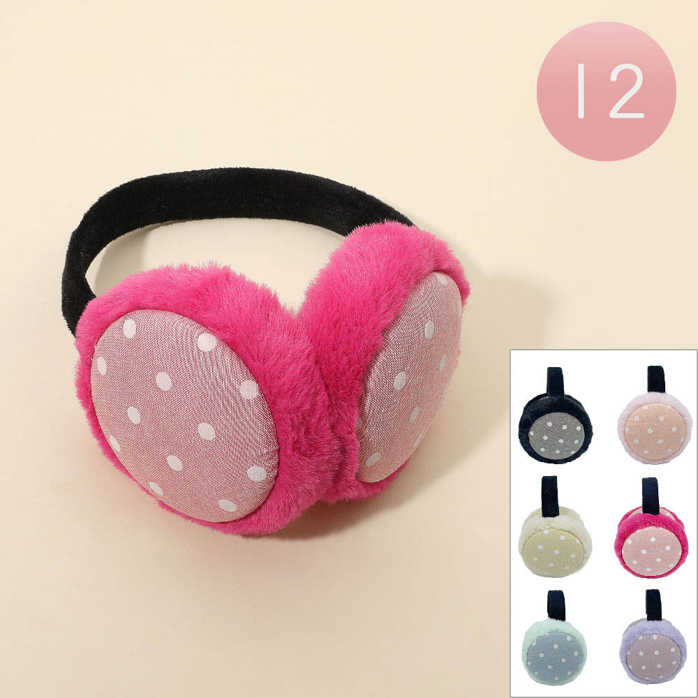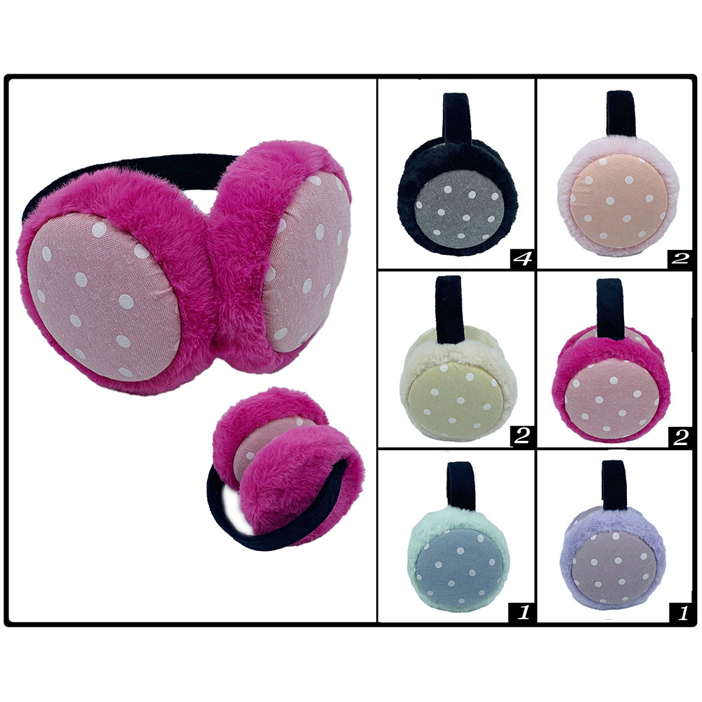 • Cozy plush earmuffs with cute polka dot design. Perfect for keeping warm in cold weather while adding a fun touch to any outfit. Comes in assorted colors. Sold as a set of 12 for bulk gifting or resale.