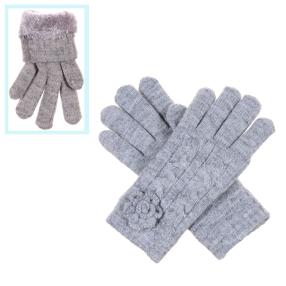 12Pairs - Faux Fur Lining Flower Detail Cable Knit Gloves