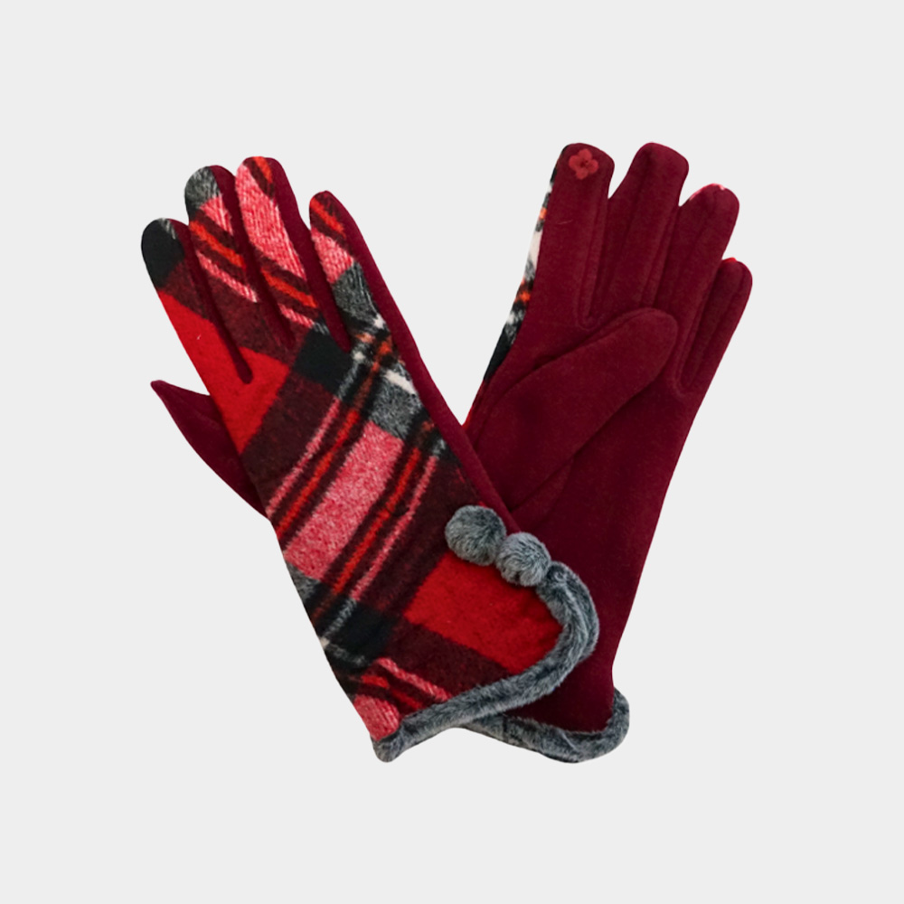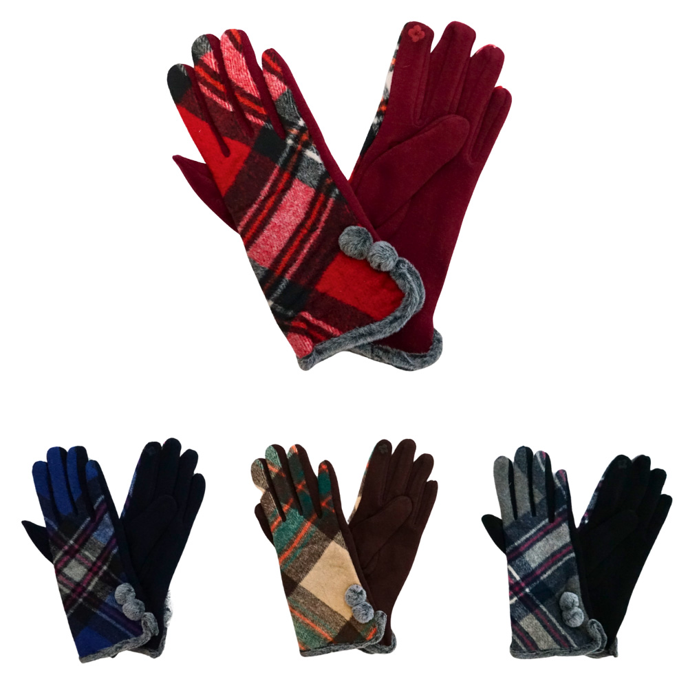 Details • Size : One Size • Material : 65% Polyester, 35% Cotton • 3Pairs BLACK / 3Pairs BROWN / 3Pairs RED / 3Pairs BLUE • Add charm and warmth to your winter look with these plaid smart touch gloves featuring pom-pom trim and touchscreen fingertips. Designed for comfort and function, they’re ideal for cold-weather wear. Available in assorted colors and patterns in a 12-pack, making them perfect for personal use or gifting.