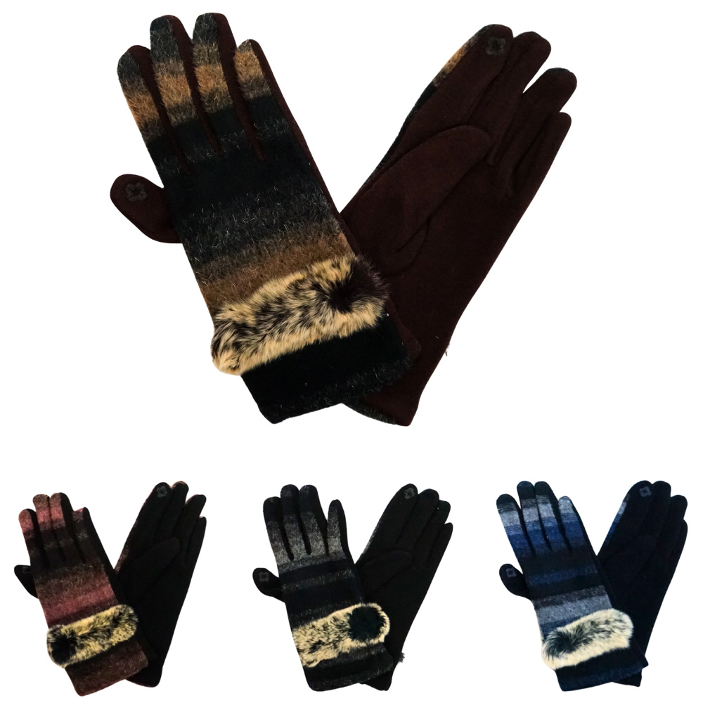 Details • Size : One Size • Material : 65% Polyester, 35% Cotton • 5Pairs BLACK / 3Pairs BROWN / 2Pairs PINK / 2Pairs NAVY • Stay warm and stylish with these striped smart touch gloves featuring soft faux fur cuffs and touchscreen fingertips. Perfect for everyday winter wear, they combine function with fashion. Sold in assorted colors and patterns in a 12-pack, making them a cozy and practical choice for personal use or gifting.