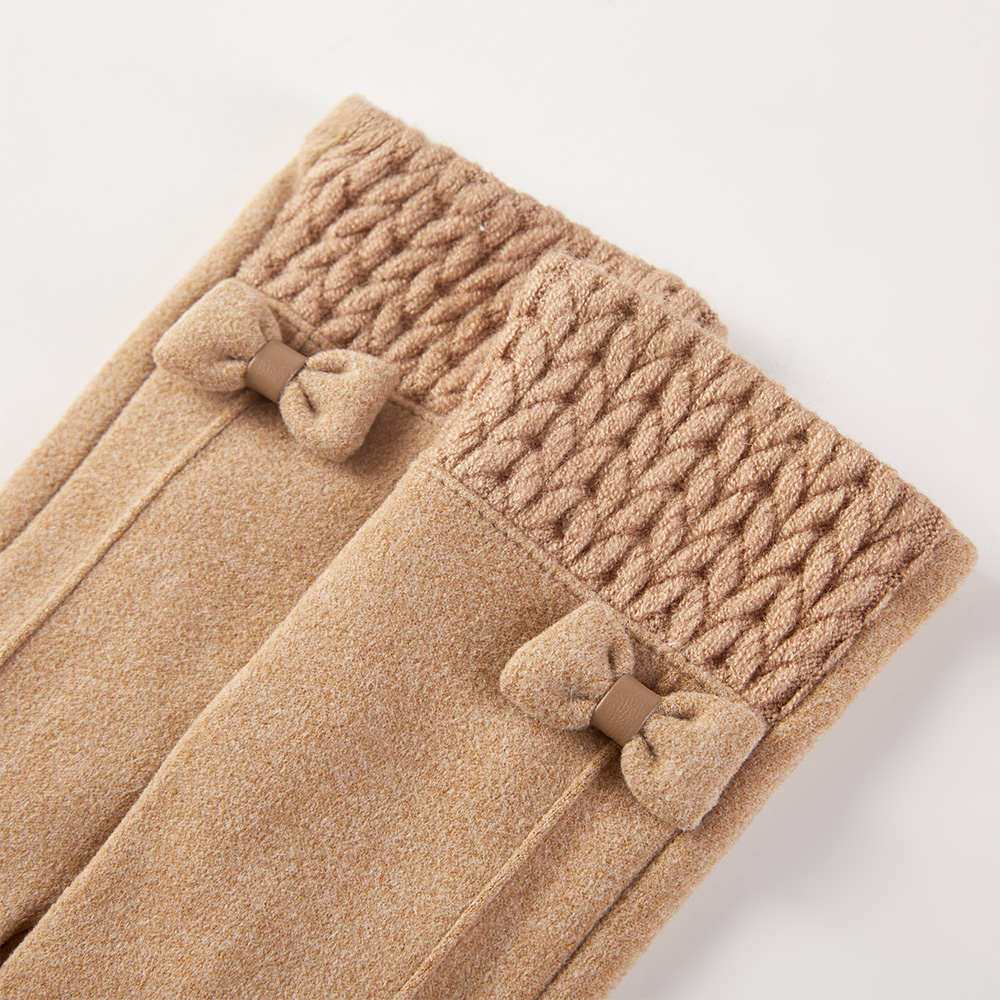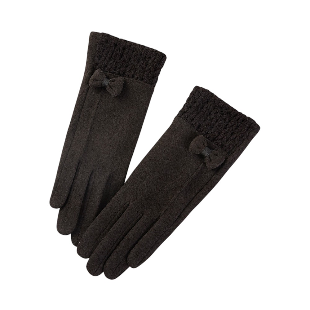 Details • Size : One Size • Smart Touch • Material : 100% Polyester • Cozy winter gloves featuring a textured knitted cuff and delicate bow accent for added charm. Soft and comfortable, these stylish gloves provide warmth while adding a feminine touch, perfect for casual wear or complementing dressy cold-weather outfits.