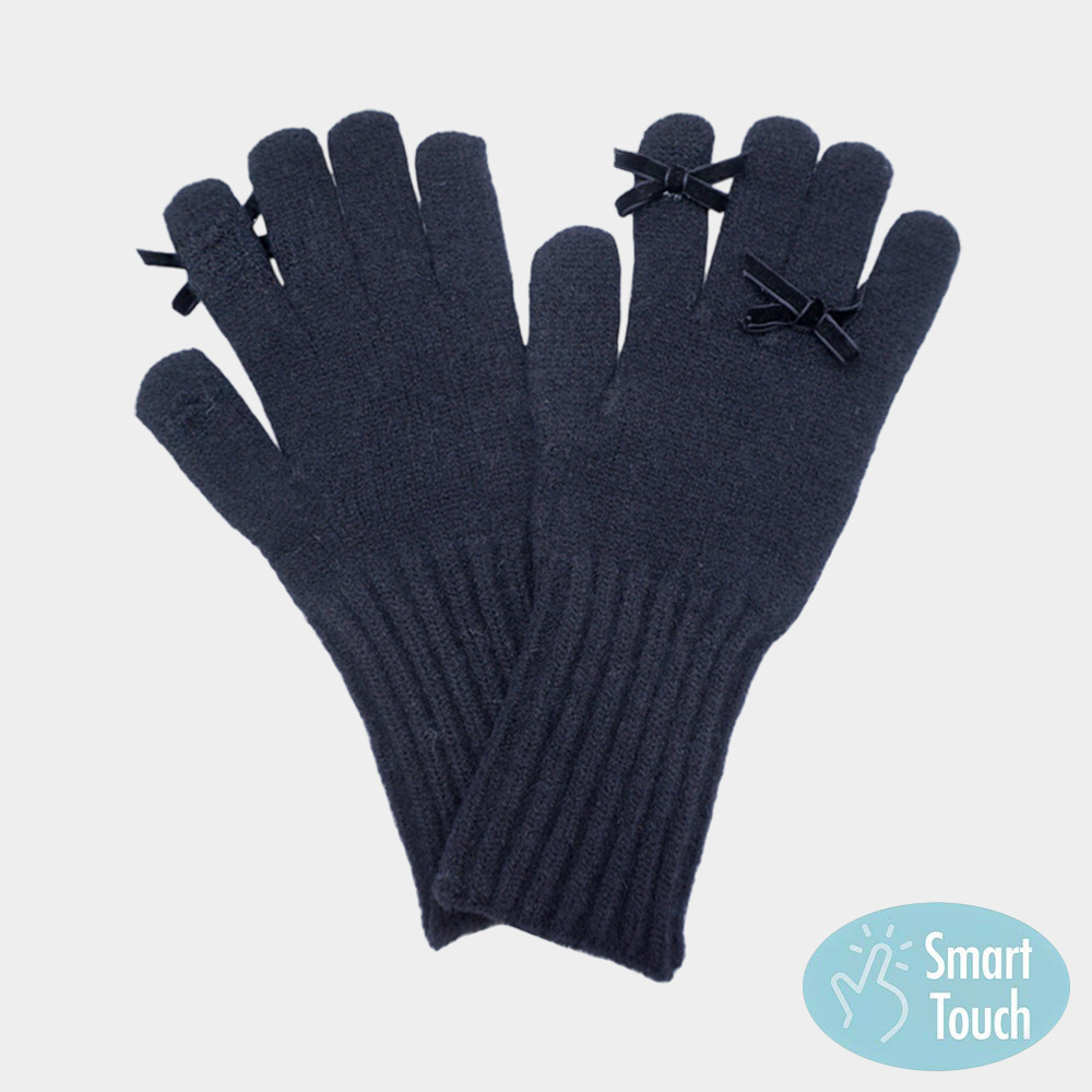 • Chic knit gloves with ribbed cuffs and charming bow accents, designed with smart touch technology for easy phone and tablet use. A stylish blend of warmth and functionality, these winter gloves add a feminine touch to cold-weather outfits while ensuring comfort and everyday practicality.
