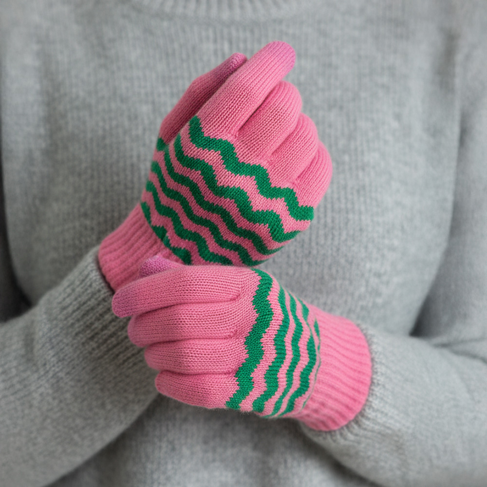 Details • Size : One Size • Material : 70% Polyester, 30% Wool • Smart Touch • Cozy knit touchscreen gloves with a bold wave pattern, perfect for winter days. Enjoy full mobile device use while keeping your hands warm and stylish with these functional and comfortable gloves.