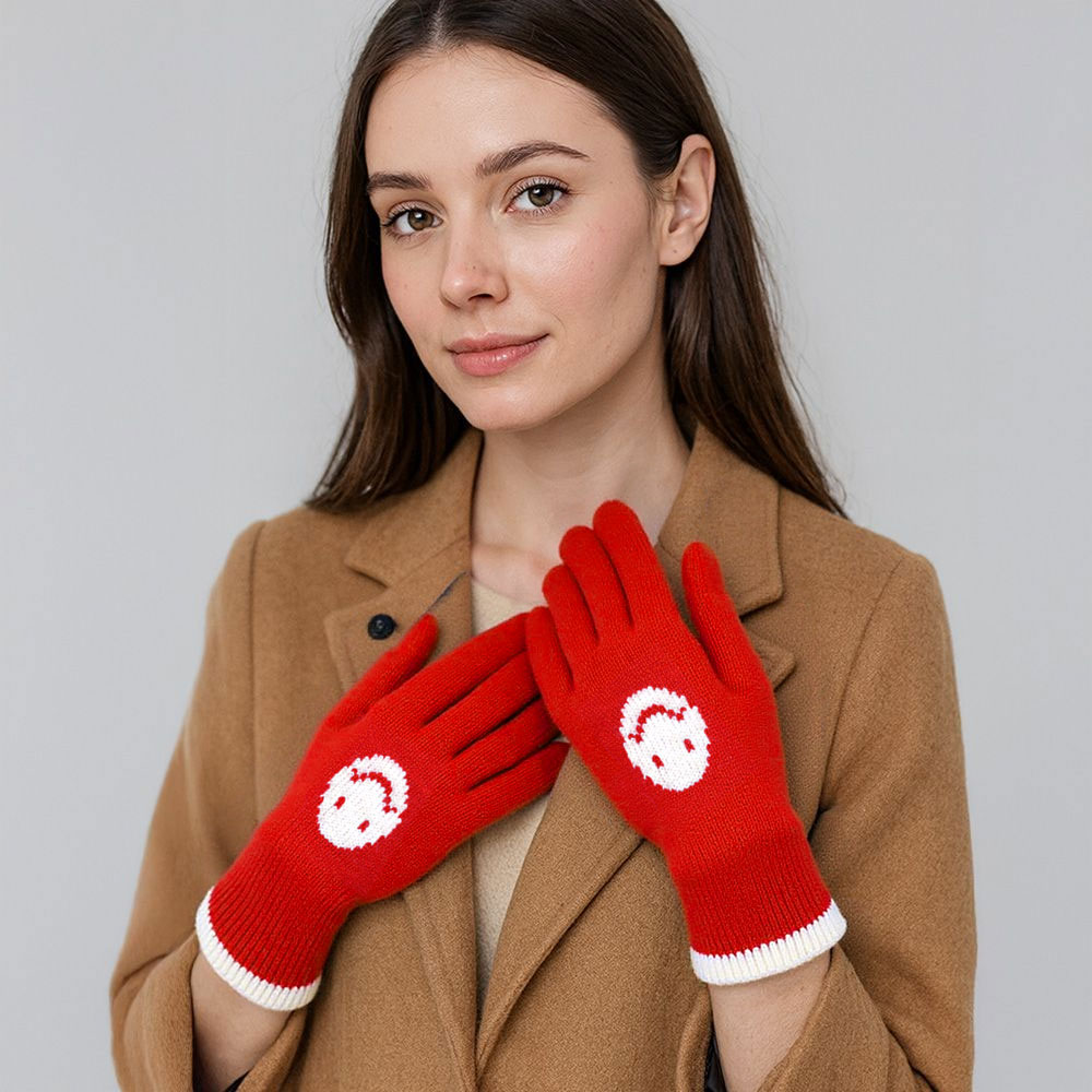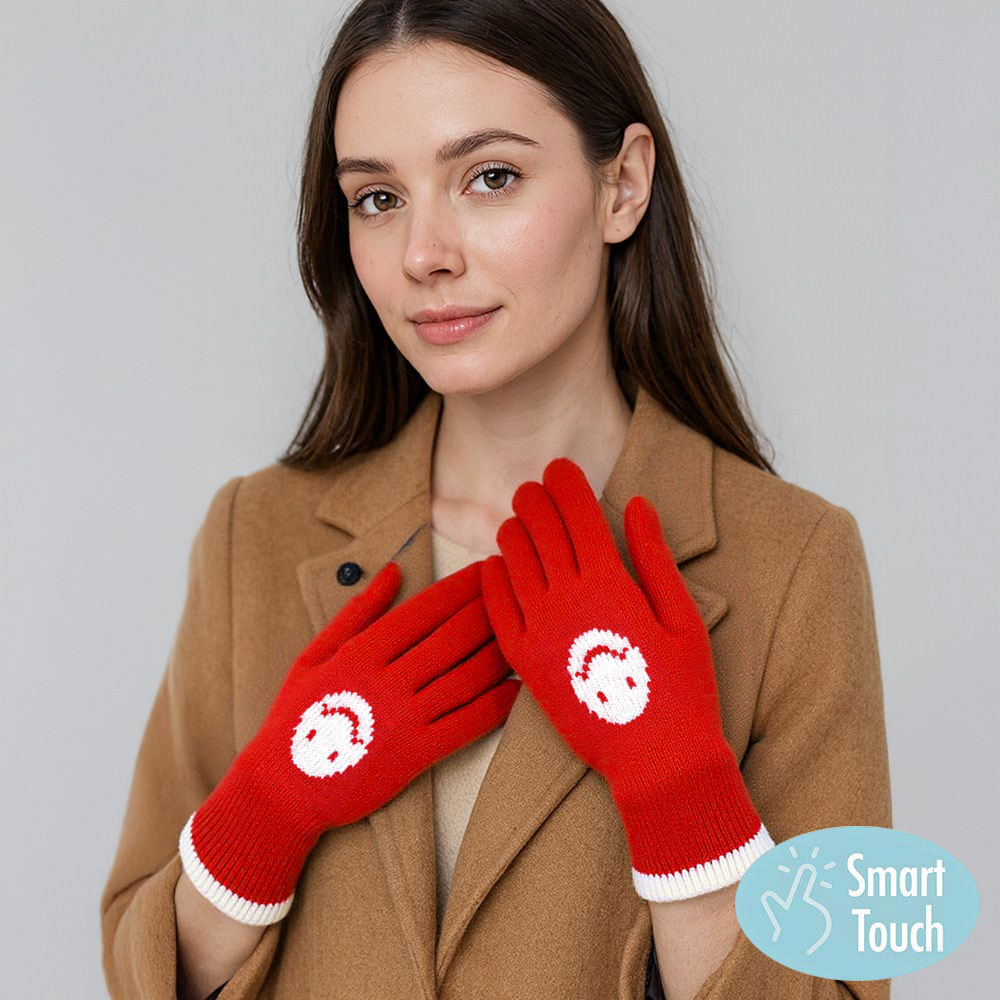 • Playful knit gloves with smiley face design and smart touch technology for effortless device use. Warm, practical, and stylish, these gloves are perfect for adding comfort and personality to your cold-weather outfits.