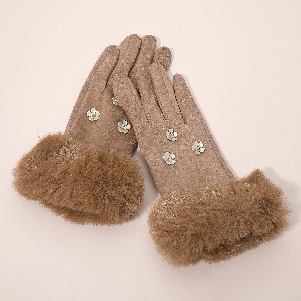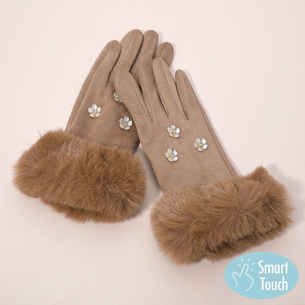 Details • Size : One Size (10" L) • Material : 100% Polyester • Smart Touch • Elegant smart touch gloves featuring faux fur cuffs and delicate floral embellishments for a chic, feminine touch. Designed for comfort and style, these gloves keep hands warm while allowing easy touchscreen use, perfect for everyday wear or adding flair to winter outfits.