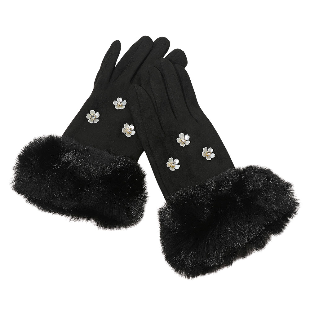 Rhinestone Flower Embellished Faux Fur Cuff Smart Touch Winter Gloves