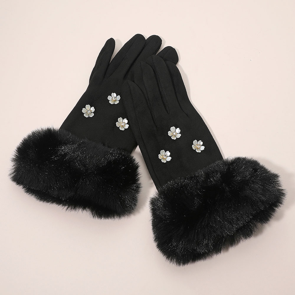 • Elegant smart touch gloves featuring faux fur cuffs and delicate floral embellishments for a chic, feminine touch. Designed for comfort and style, these gloves keep hands warm while allowing easy touchscreen use, perfect for everyday wear or adding flair to winter outfits.