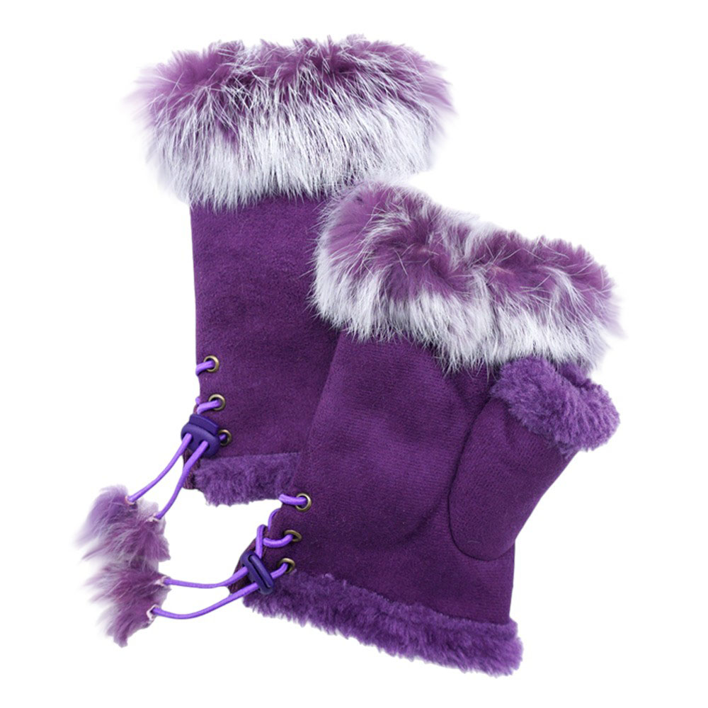 • Elevate your winter style with these real fur trim gloves featuring a cozy fingerless mitten design and lace-up side ties with pom pom accents. Luxurious yet practical, they keep hands warm while allowing flexibility, making them a chic and functional accessory for cold-weather outfits.