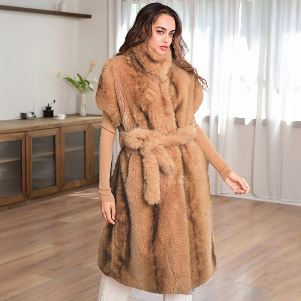 • Elegant women’s long faux fur vest with belted waist for a chic, cozy look. Perfect winter outerwear for layering, offering warmth and timeless style. Designed with a soft, luxurious feel, this sleeveless vest elevates casual or dressy outfits, making it an essential piece for cold-weather fashion.