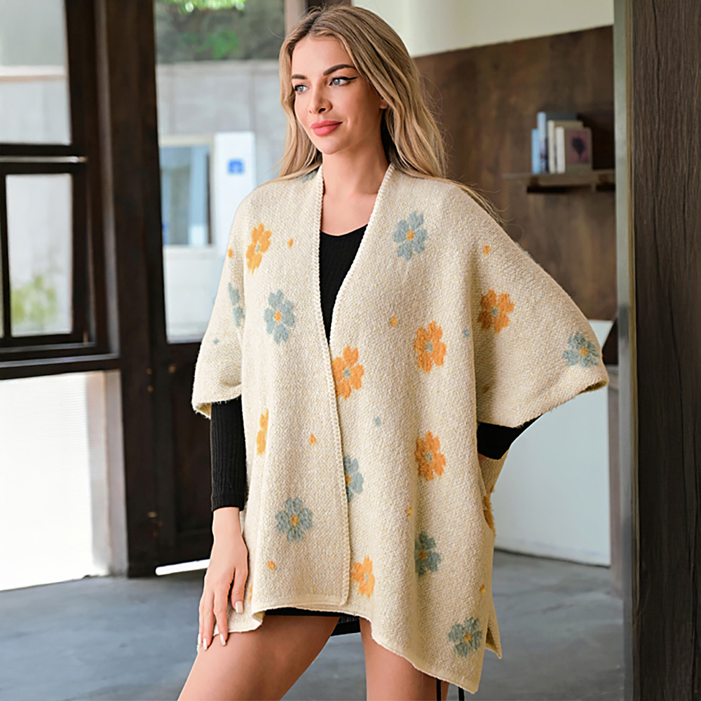 Details • Size : 3.5.4" X 24.8" • Material : 100% Acrylic • Stylish floral poncho with an open-front design, offering a cozy and relaxed fit. Perfect for layering, this versatile piece adds a touch of charm and comfort to casual or dressy looks, making it an essential accessory for any wardrobe.