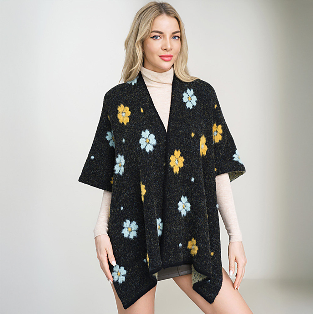 Details • Size : 3.5.4" X 24.8" • Material : 100% Acrylic • Stylish floral poncho with an open-front design, offering a cozy and relaxed fit. Perfect for layering, this versatile piece adds a touch of charm and comfort to casual or dressy looks, making it an essential accessory for any wardrobe.