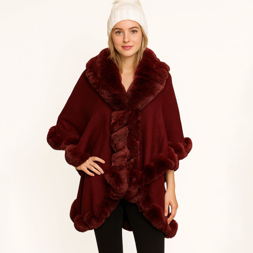 • Chic and cozy cape with luxurious faux fur trim. Perfect for layering on cold days while keeping an elegant silhouette.