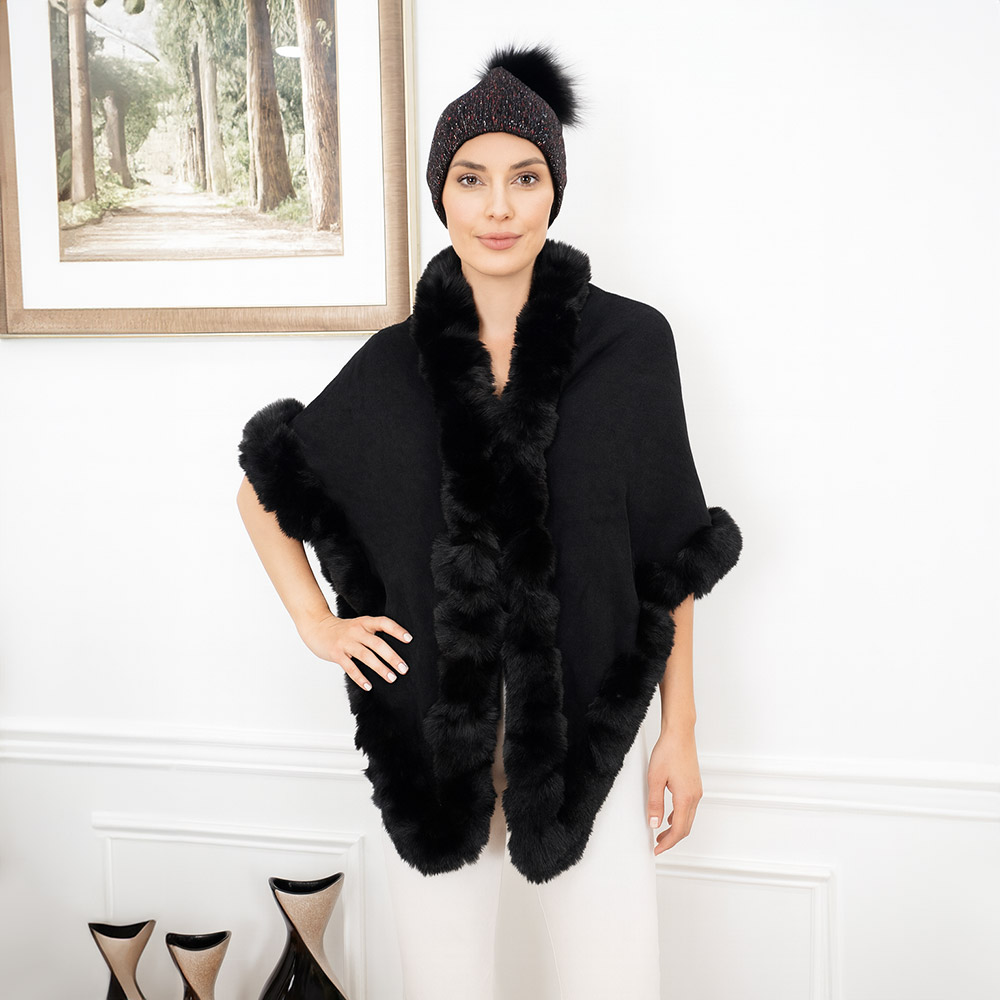 • This striking short-sleeve cape is designed with plush fur trim along the collar and edges, creating a dramatic silhouette. Perfect for layering, it blends comfort with refined style, making it a versatile statement piece for both casual and evening wear.