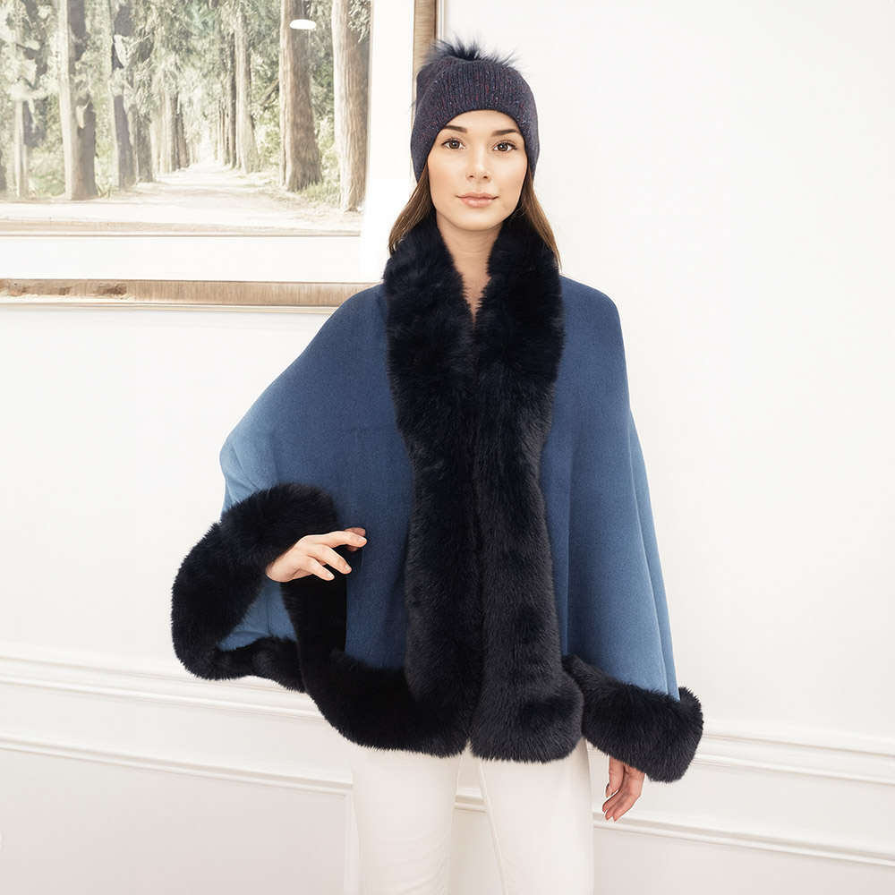 • This sophisticated cape features a plush fur trim along the collar, hem, and sleeves, creating a refined silhouette. Perfect for layering in cool seasons, it offers timeless elegance and versatile wear, whether paired with casual looks or evening attire.
