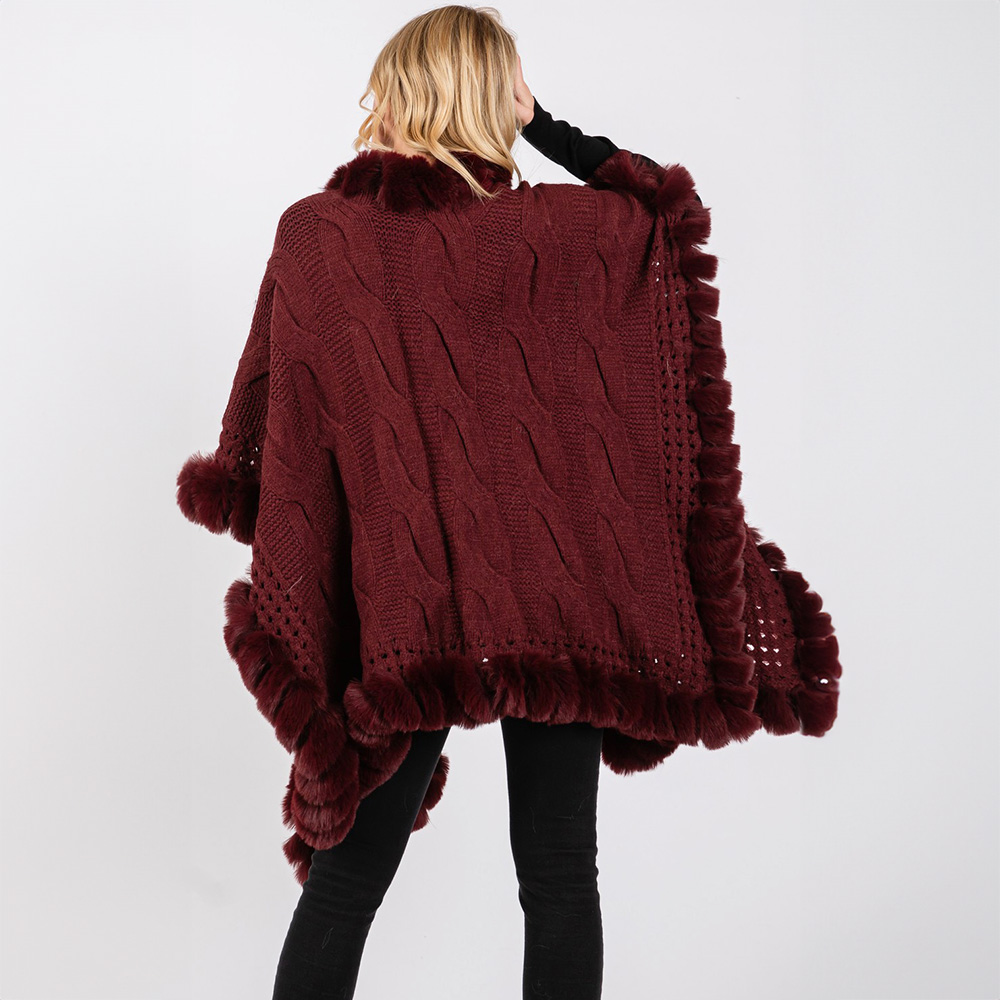 • Chic cable knit poncho wrap featuring a soft faux fur trim for added warmth and texture. Designed for stylish layering, this relaxed silhouette pairs effortlessly with everyday or evening looks. A cozy must-have for cooler weather.