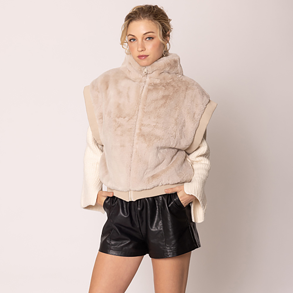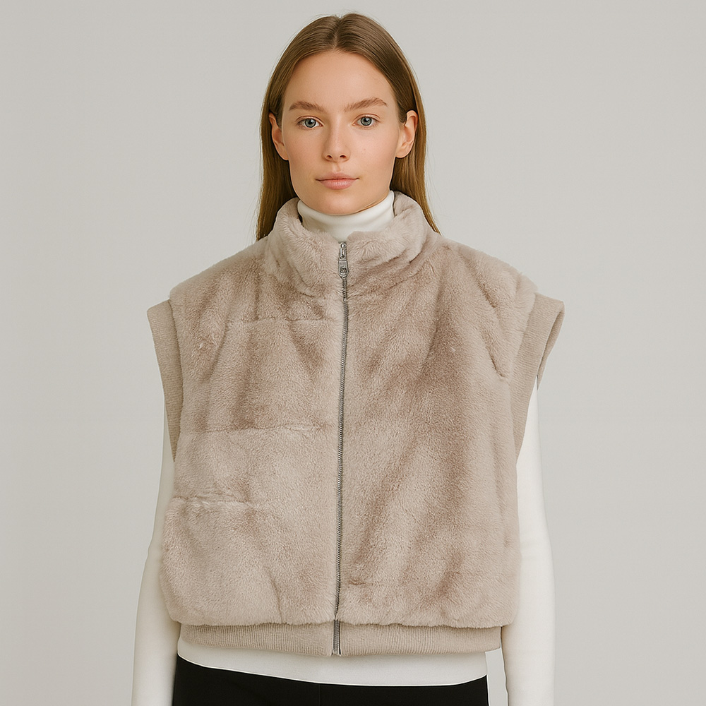 Details • Size : 22" X 21.7" • Material : 100% Polyester • Stay cozy and chic in this sleeveless faux fur vest with a full zipper front and high collar. Perfect for layering over sweaters or tops, it adds warmth and modern elegance to casual and dressy looks. A versatile outerwear piece designed for style and comfort in any season.