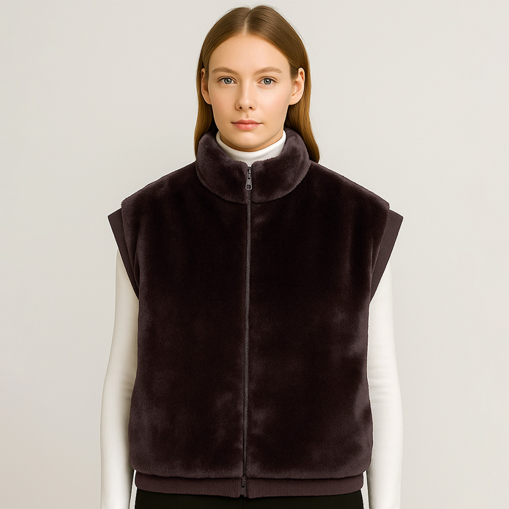 • Stay cozy and chic in this sleeveless faux fur vest with a full zipper front and high collar. Perfect for layering over sweaters or tops, it adds warmth and modern elegance to casual and dressy looks. A versatile outerwear piece designed for style and comfort in any season.
