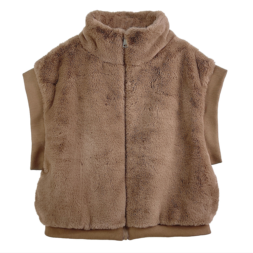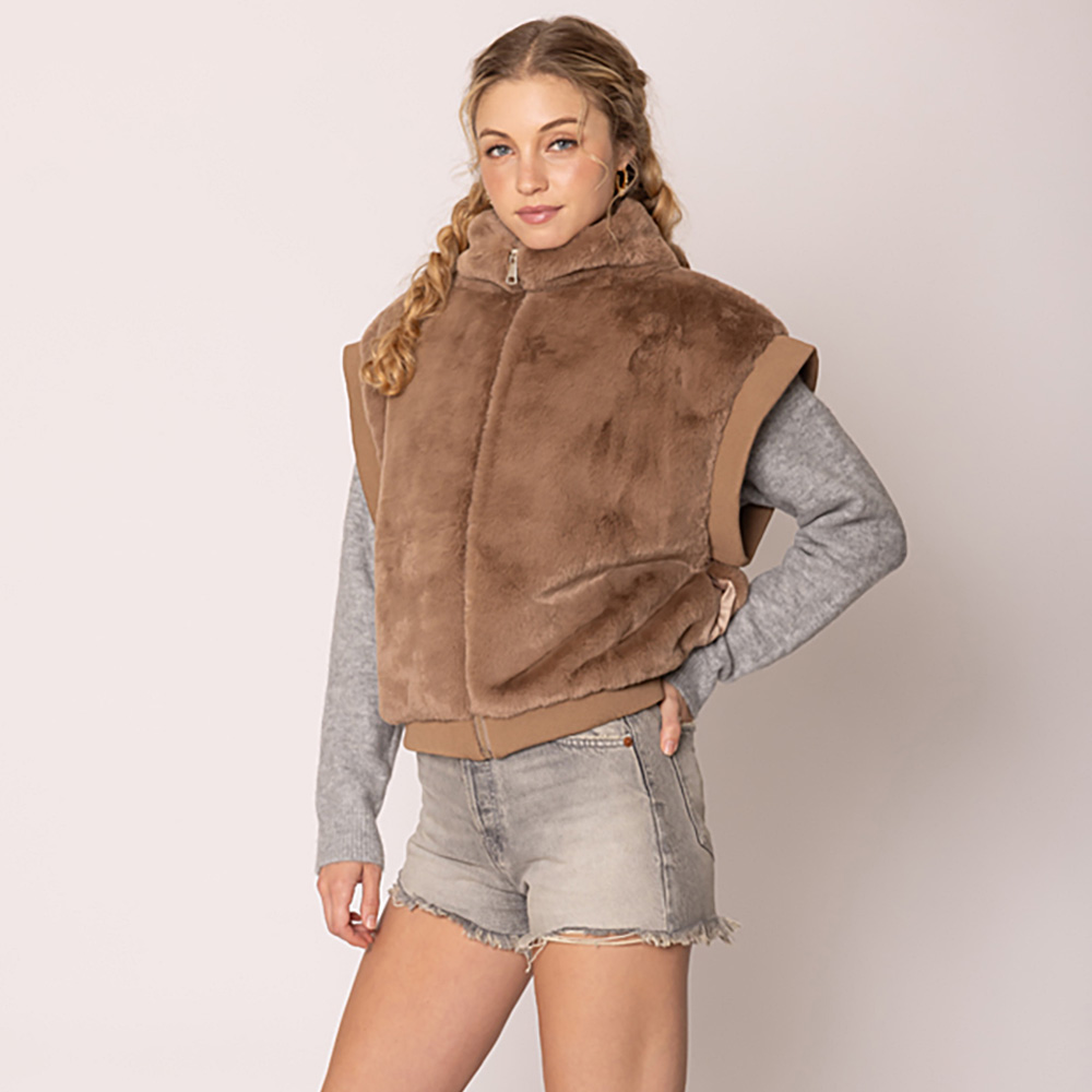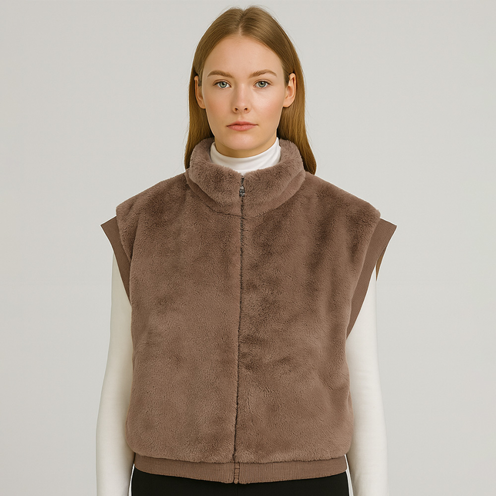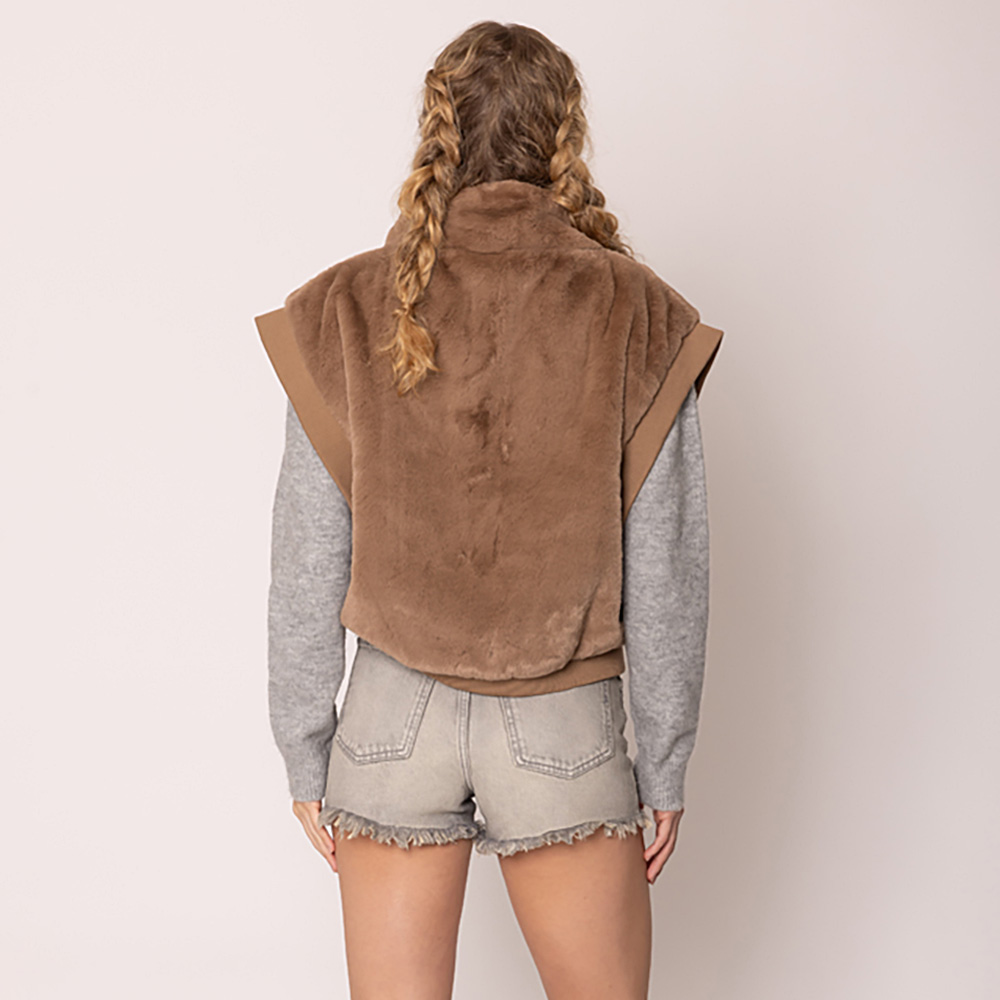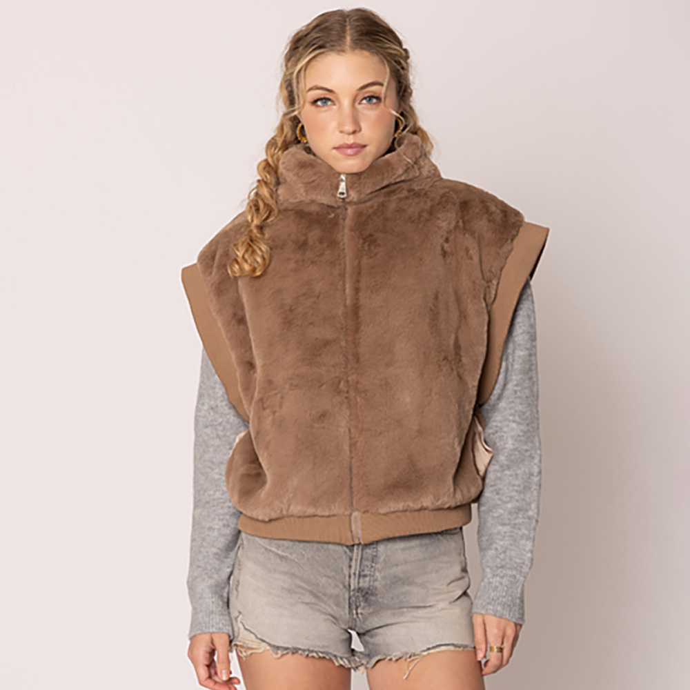 Details • Size : 22" X 21.7" • Material : 100% Polyester • Stay cozy and chic in this sleeveless faux fur vest with a full zipper front and high collar. Perfect for layering over sweaters or tops, it adds warmth and modern elegance to casual and dressy looks. A versatile outerwear piece designed for style and comfort in any season.
