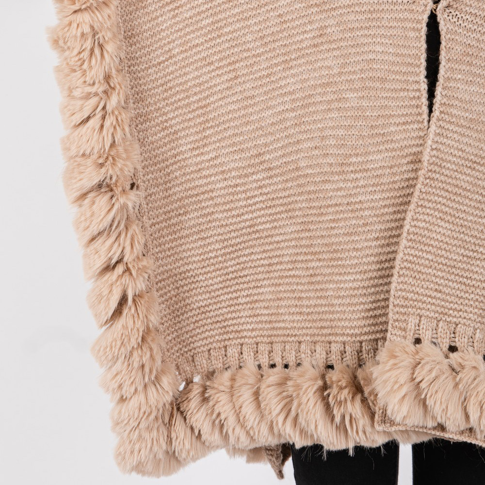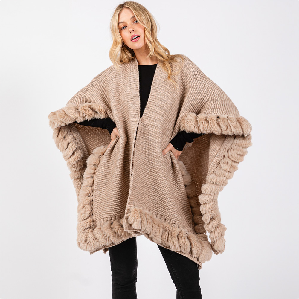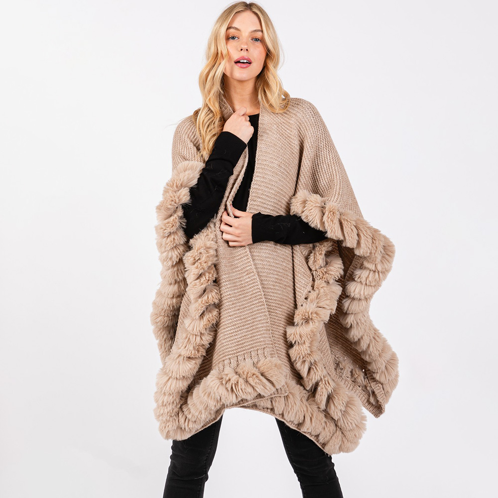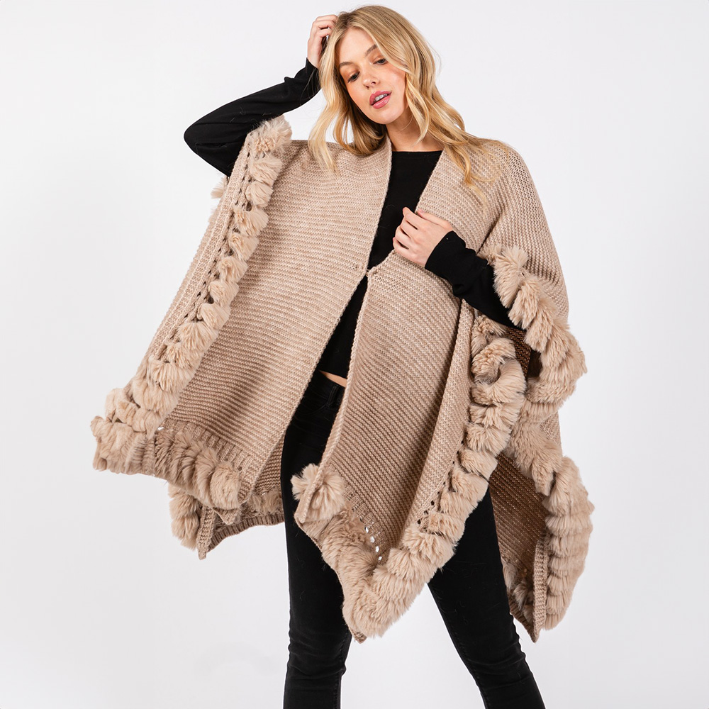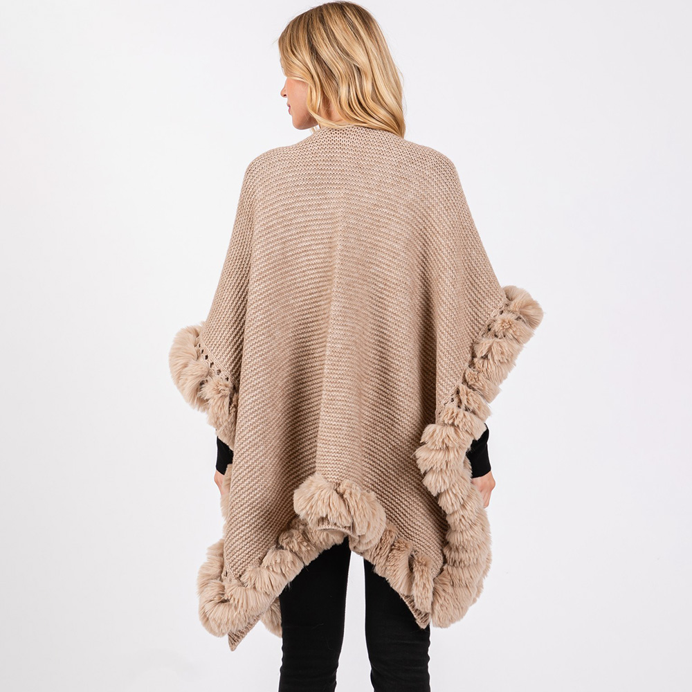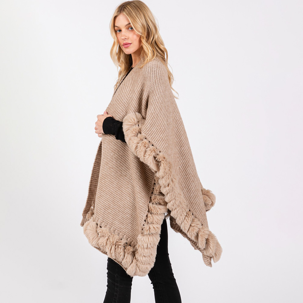 Details • Size : 27.5" X 37" • Material : 80% Acrylic, 20% Polyester • Luxurious knit poncho cape with a plush faux fur trim, offering a cozy yet polished look for chilly days. Its flowing silhouette and textured design provide effortless layering for both casual and dressed-up outfits.