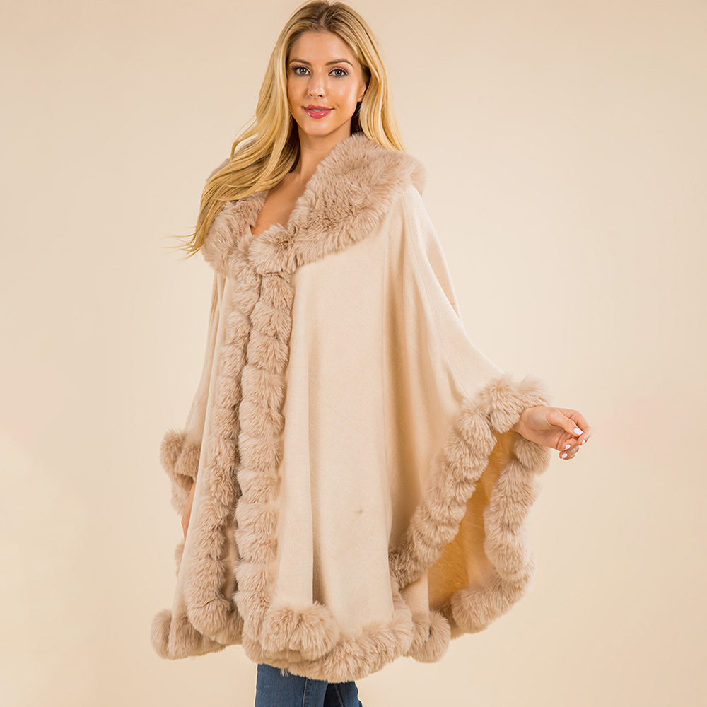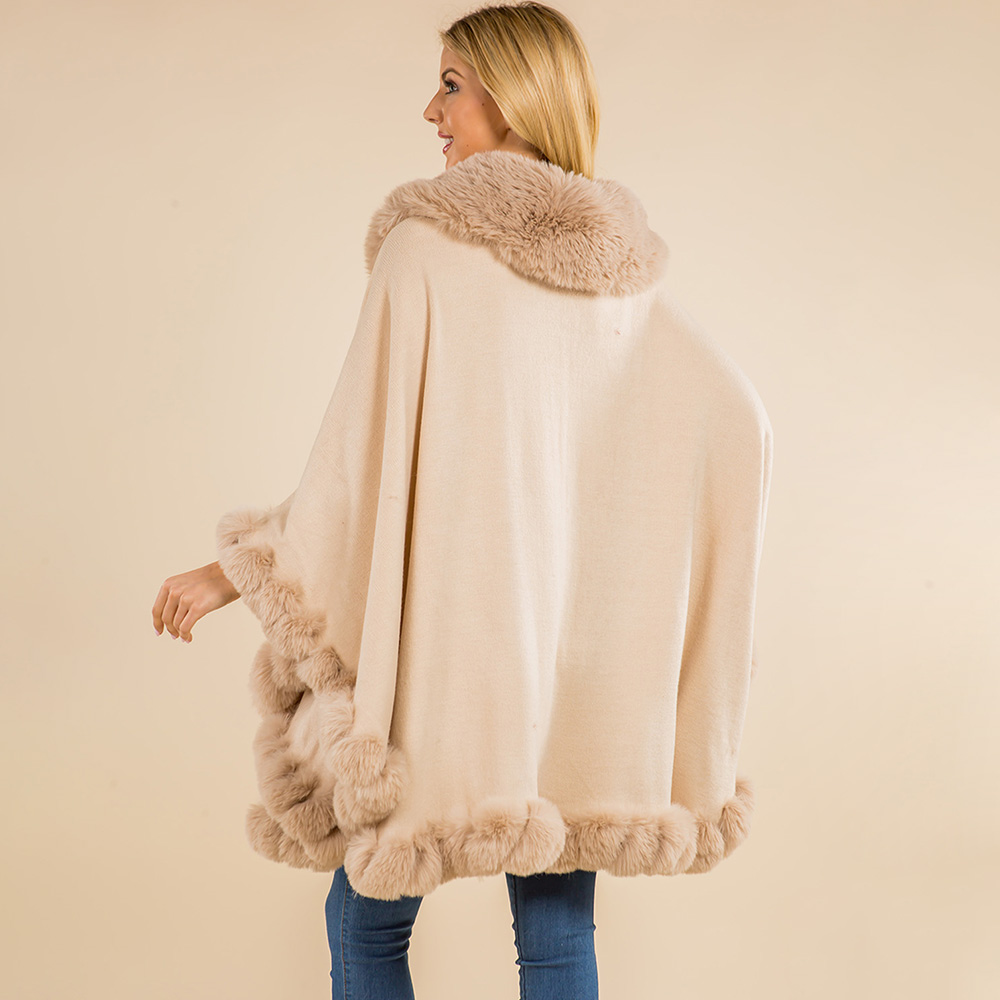 Details • Size : One Size • Material : 100% Acrylic • Elegant cape featuring plush faux fur trim and a flowing open design that combines warmth with timeless style. Perfect for layering over casual or formal outfits, this versatile piece adds a touch of sophistication and comfort to any wardrobe.