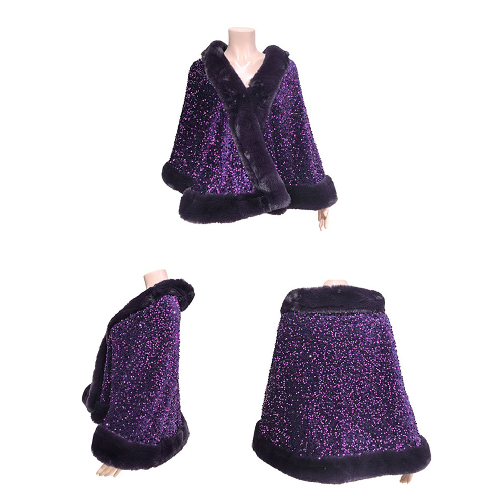 Festive Sequin Faux Fur Trim Shawl Poncho