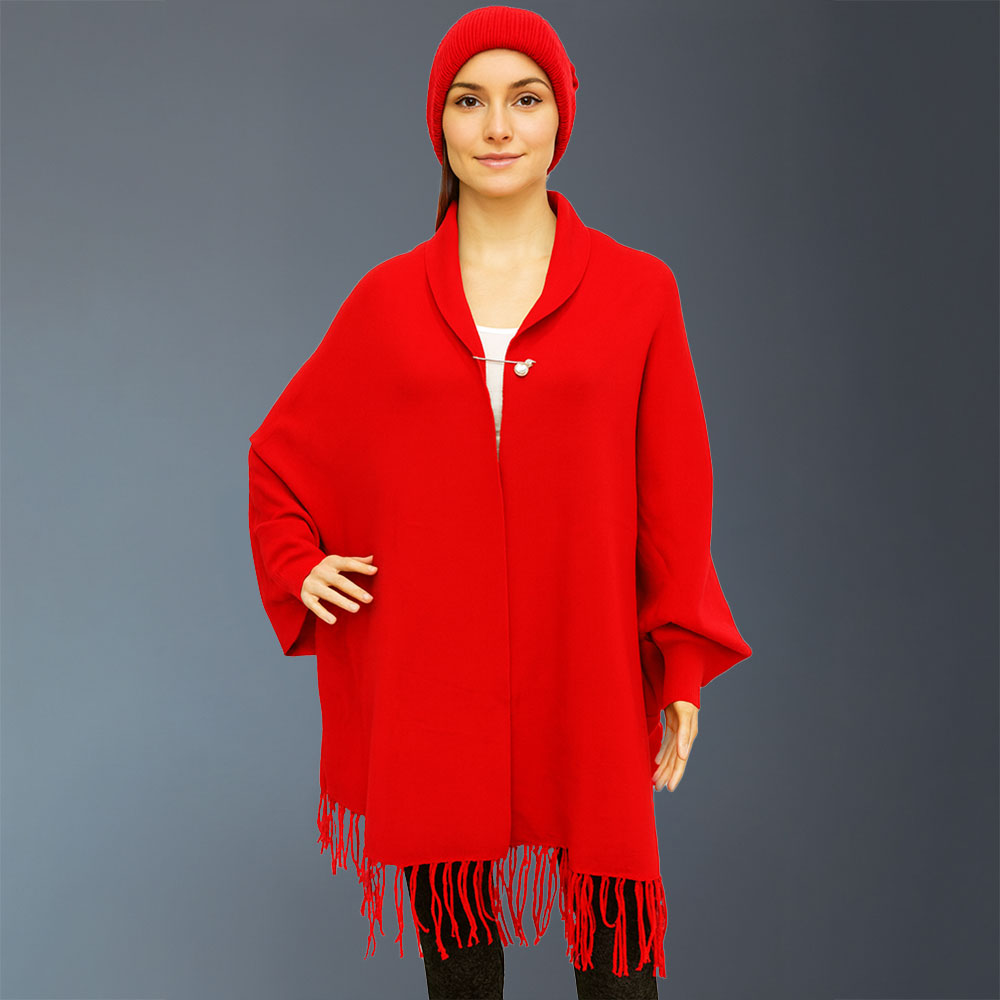 Details • Size : One Size • Material : 100% Acrylic • Stylish shawl wrap featuring a draped open-front silhouette, and playful fringe trim. A versatile layering accessory that adds warmth and elegance to casual or dressy outfits, perfect for everyday wear.