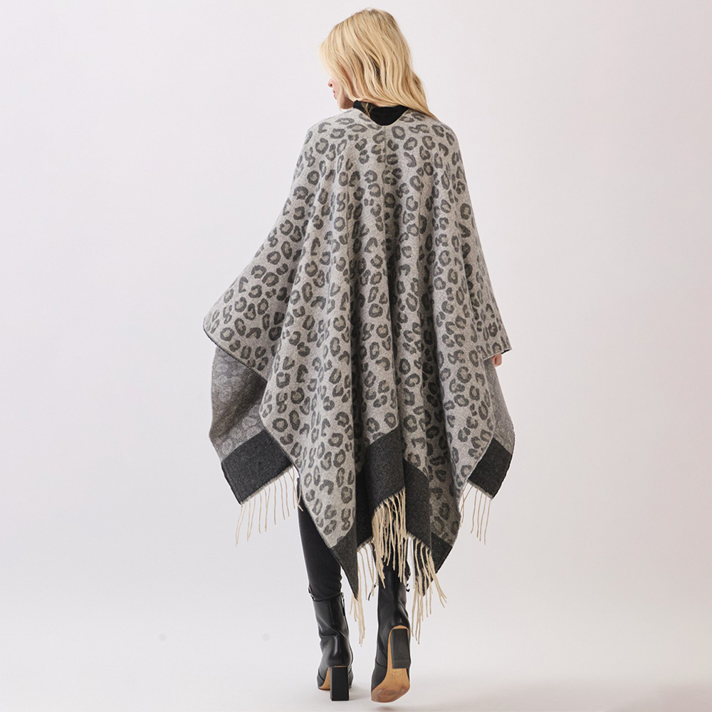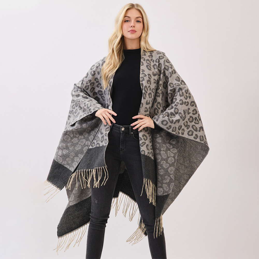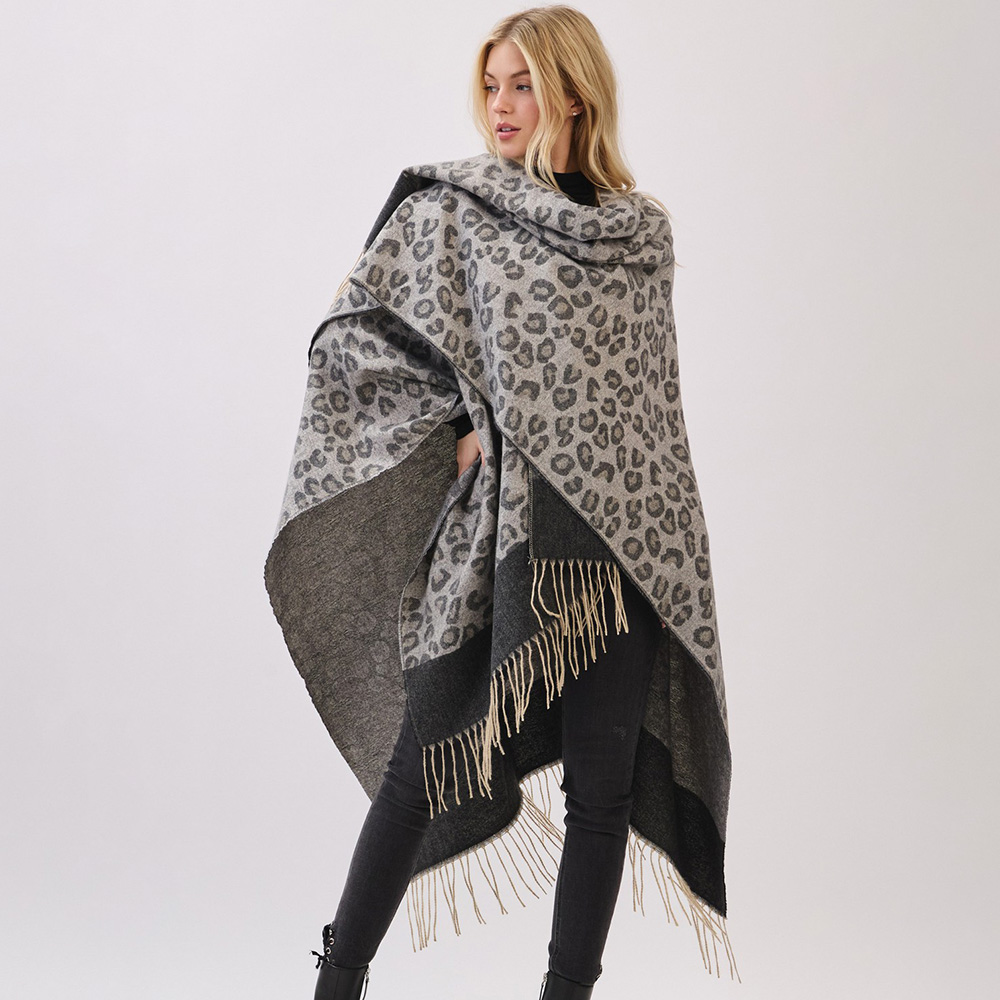 Details • Size : 56" X 33.5" • Material : 100% Polyester • A soft poncho wrap featuring a bold leopard pattern with a contrasting border and fringe hem. Designed for easy layering, this cozy piece brings warmth, comfort, and a chic statement look to seasonal outfits.