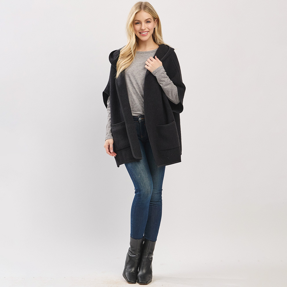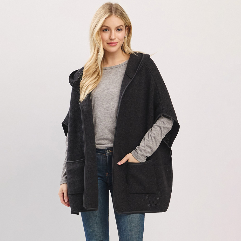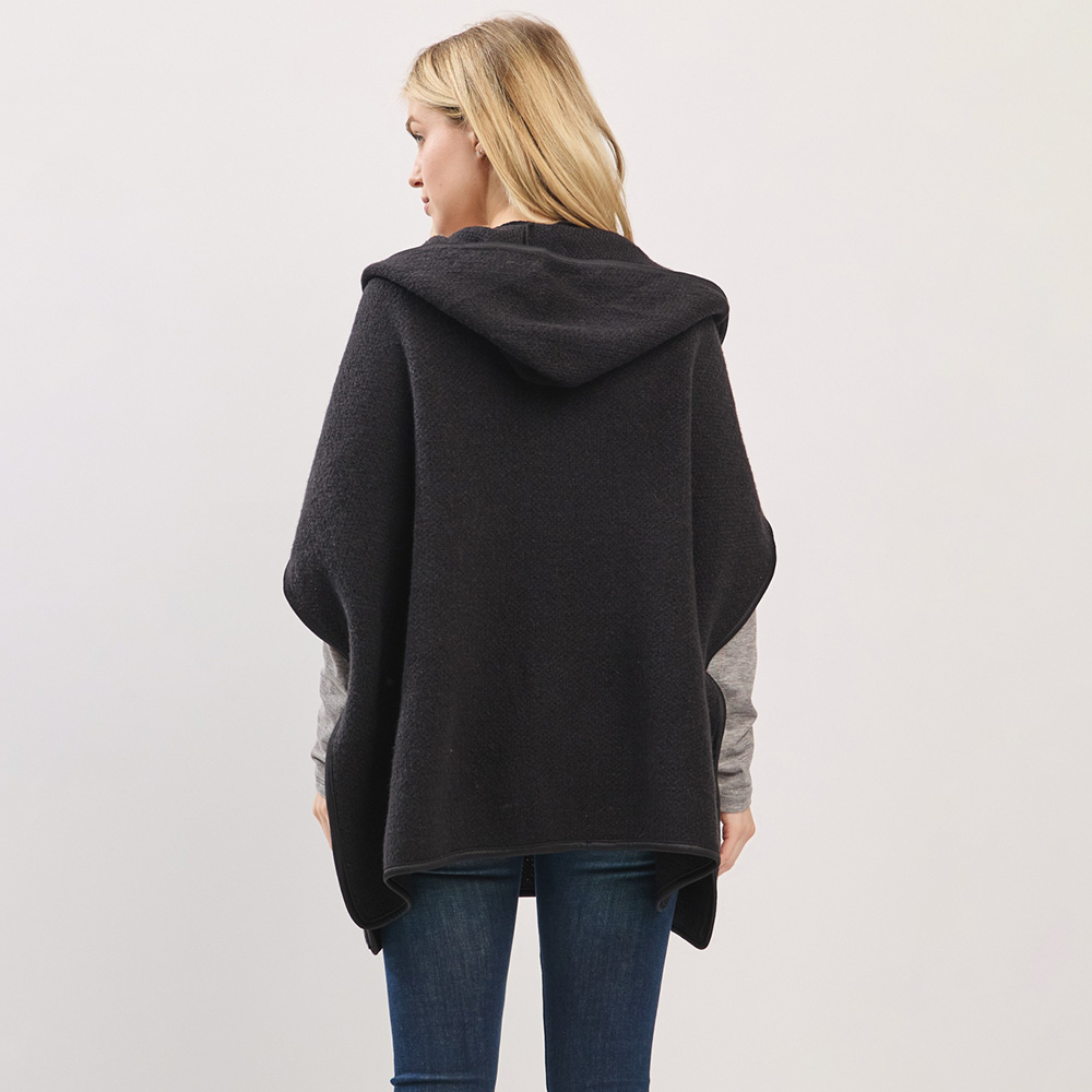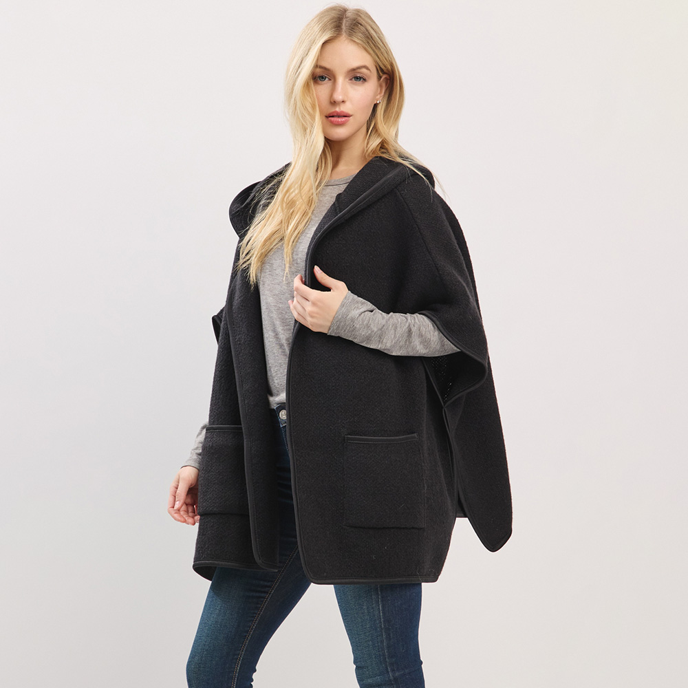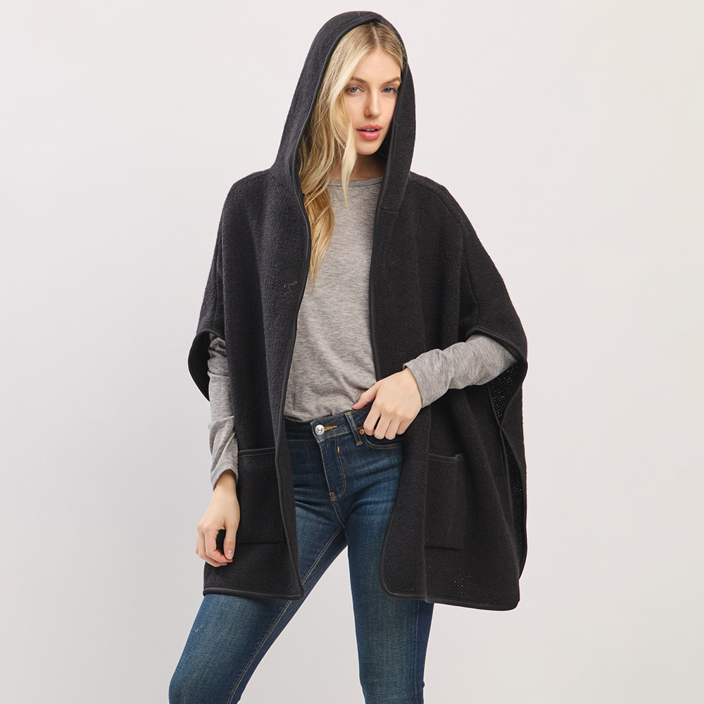 Details • Size : 31.5" X 27.5" • Material : 100% Polyester • A cozy poncho wrap designed with a relaxed fit, attached hood, and front pockets for added function. Easy to layer over casual or dressy looks, this versatile piece provides warmth and everyday comfort with effortless style.