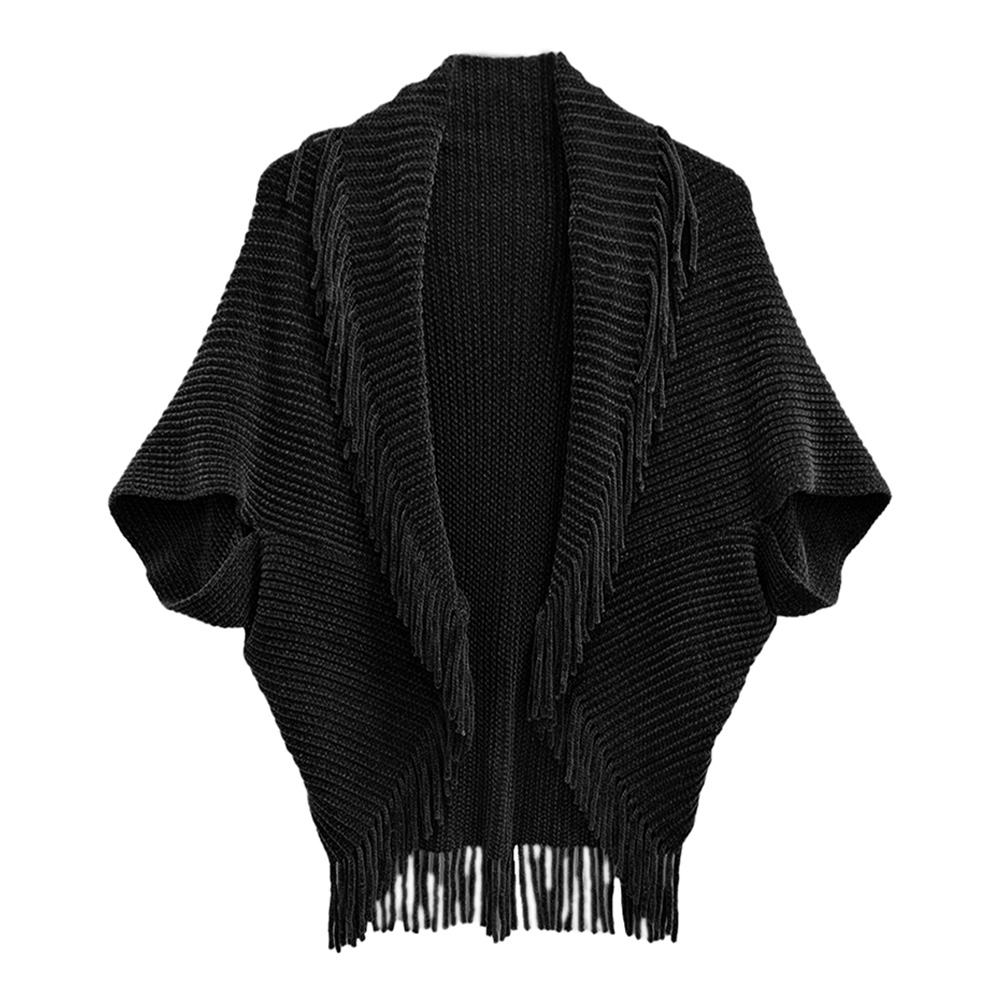 Details • Size : 35.4" X 29.9" • Tassel/Fringe Trim Size : 3.9" L • Material : 100% Acrylic • Stay cozy and stylish with this knitted shawl featuring a chic fringe trim. Its open front design and relaxed fit make it perfect for layering over any outfit. Versatile and comfortable, this shawl adds a touch of boho charm to casual looks while keeping you warm and fashionable.